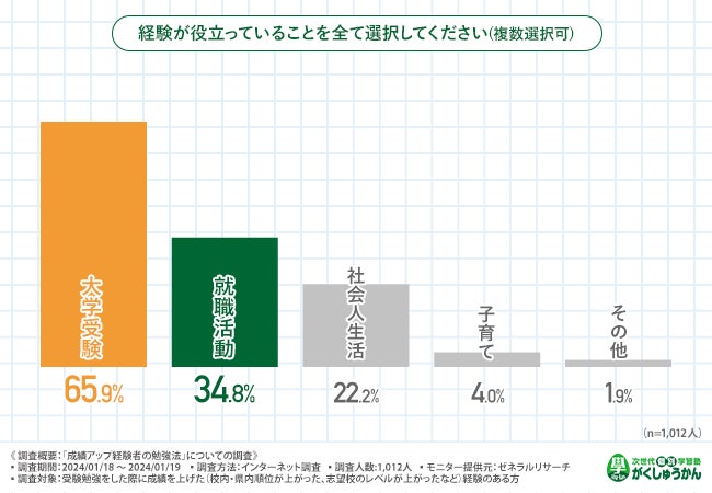 次に、「経験が役立っていることを全て選択してください(複数選択可)」と質問したところ、『大学受験(65.9%)』と回答した方が最も多く、次いで『就職活動(34.8%)』と続きました。