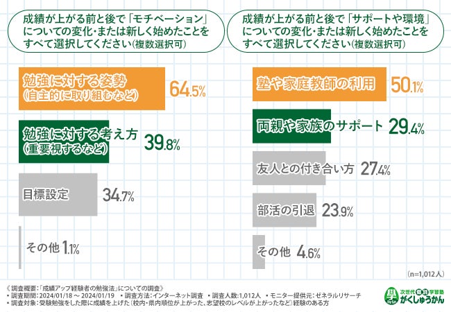 今回の調査では、成績向上をした経験者が、成績が上がる前後でどのような変化を経験し、何を重視しているかが明らかになりました。