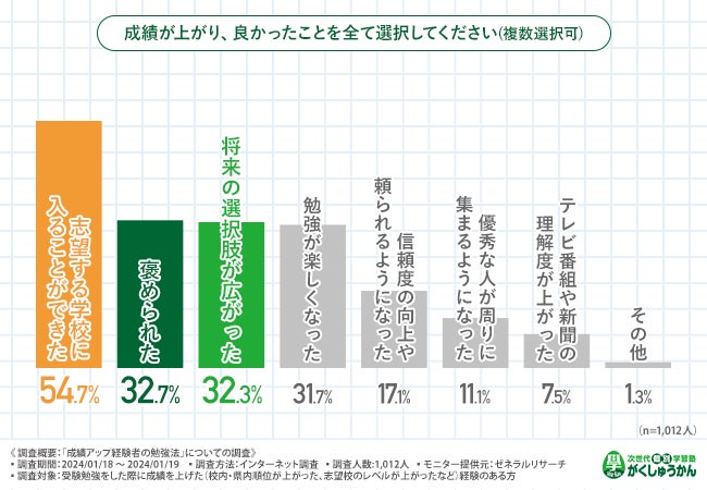 「成績が上がり、良かったことを全て選択してください(複数選択可)」と質問したところ、『志望する学校に入ることができた(54.7%)』と回答した方が最も多く、次いで『褒められた(32.7%)』『将来の選択肢が広がった(32.3%)』と続きました。