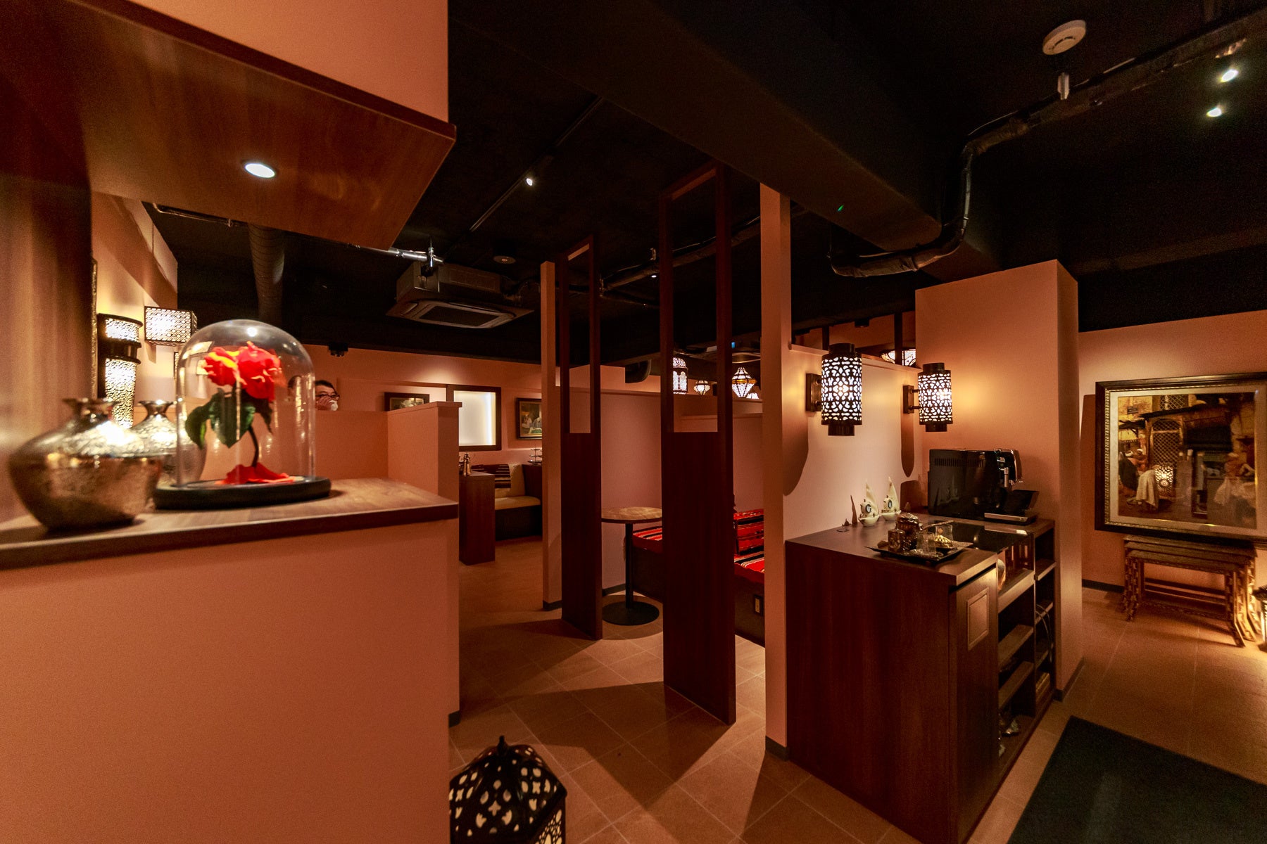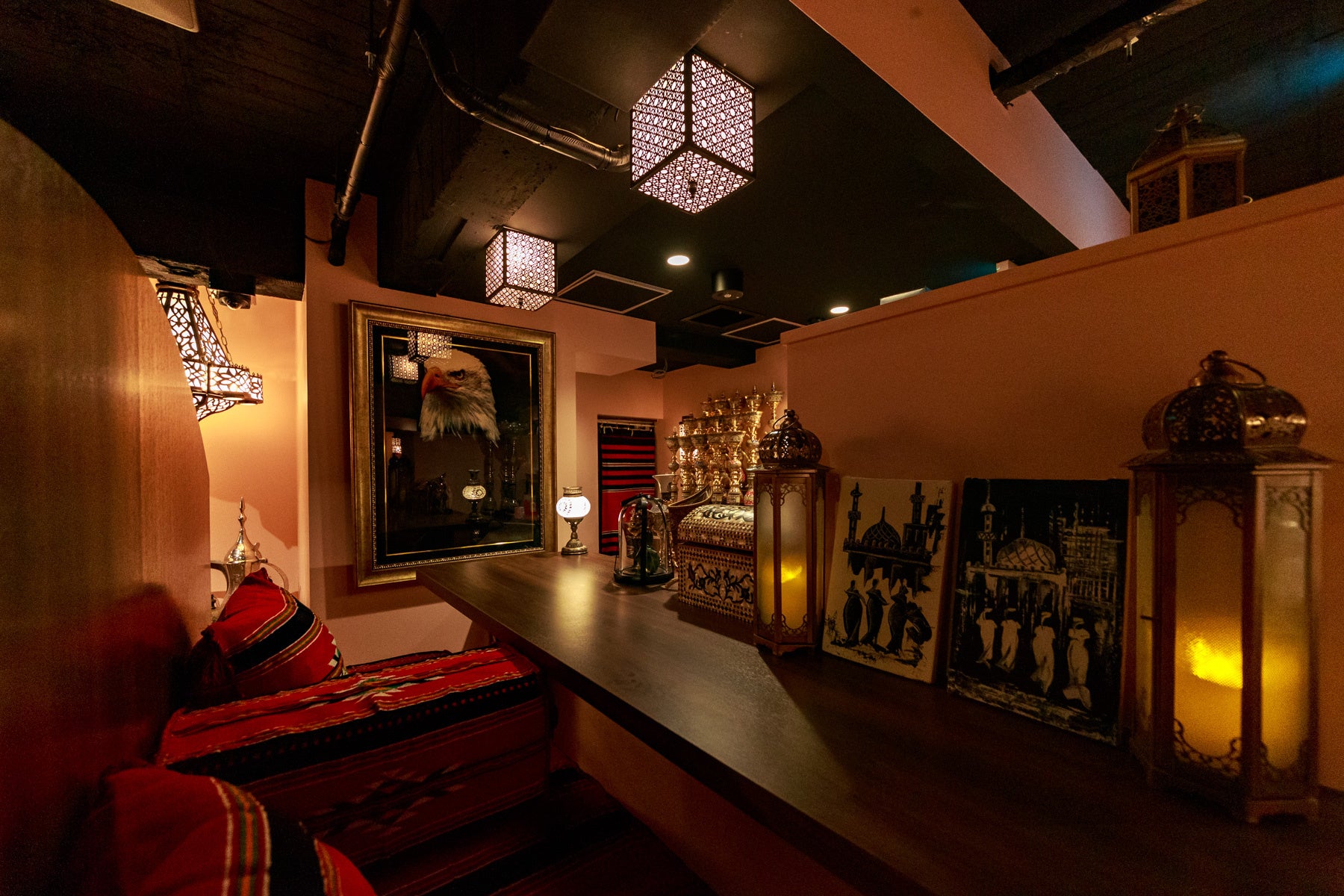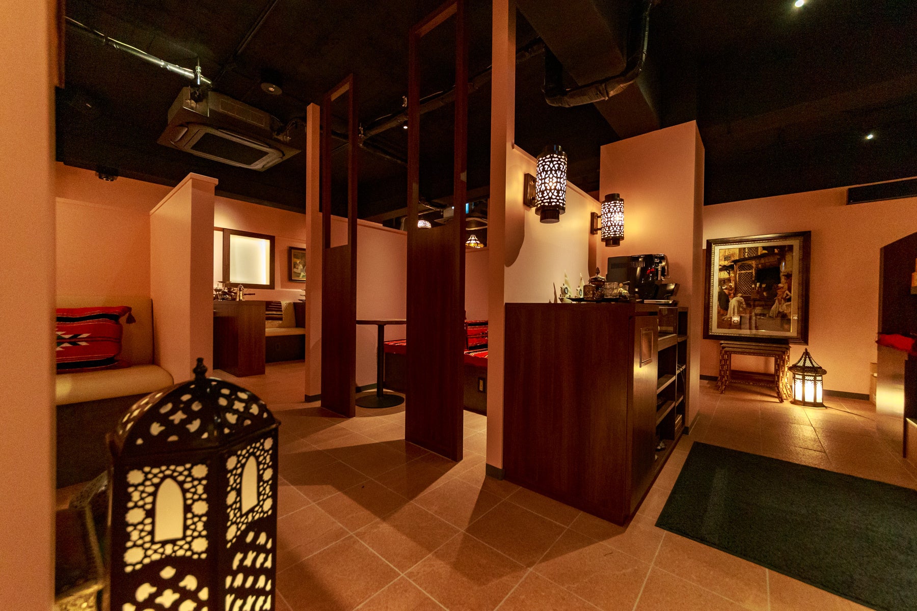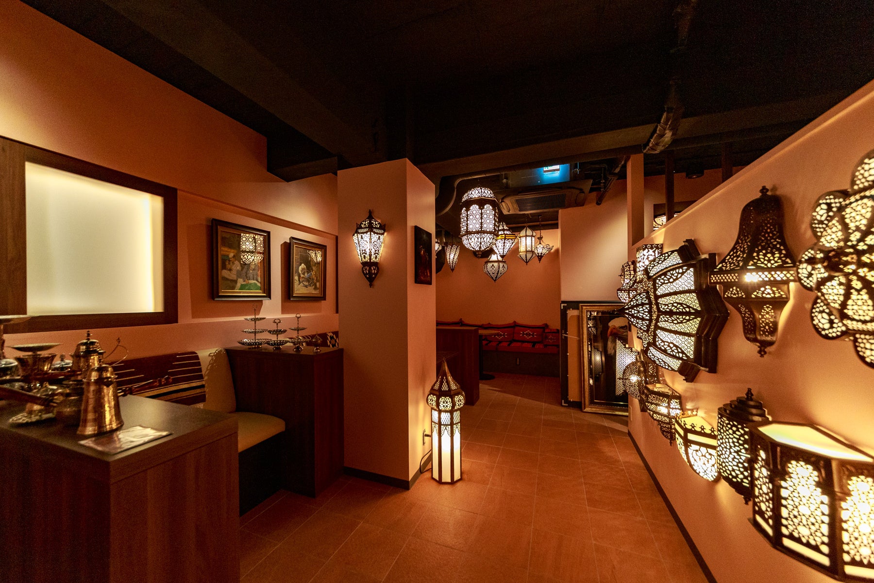 また内装・インテリアもドバイを忠実に再現し、特徴的なランプ類もすべてUAE(アラブ首長国連邦)から直輸入というこだわり。単にシーシャを楽しむだけではなく、まるでドバイのカフェに入ったような旅行気分にさせてくれる演出がふんだんに盛り込まれている。