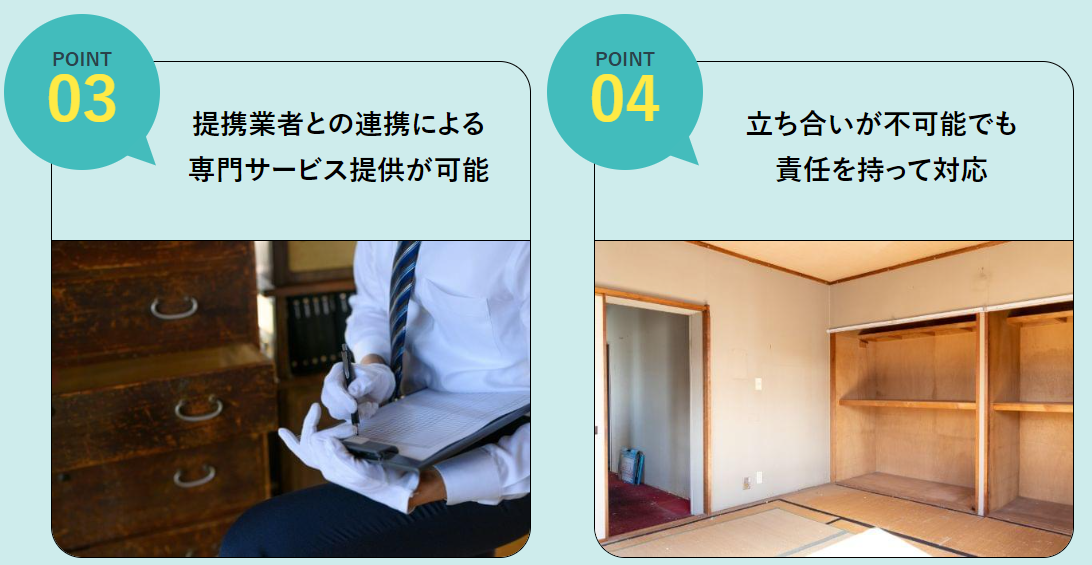 “かたみわけ”は、大切な人を失い悲しみに暮れるご遺族の負担をやわらげる、ご相談からアフターフォローまでワンストップで生前整理・事前整理を行うお片付けサービスで、次の特徴がございます。