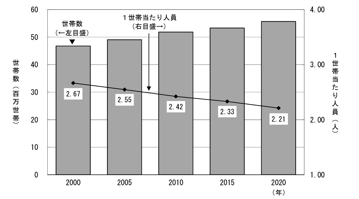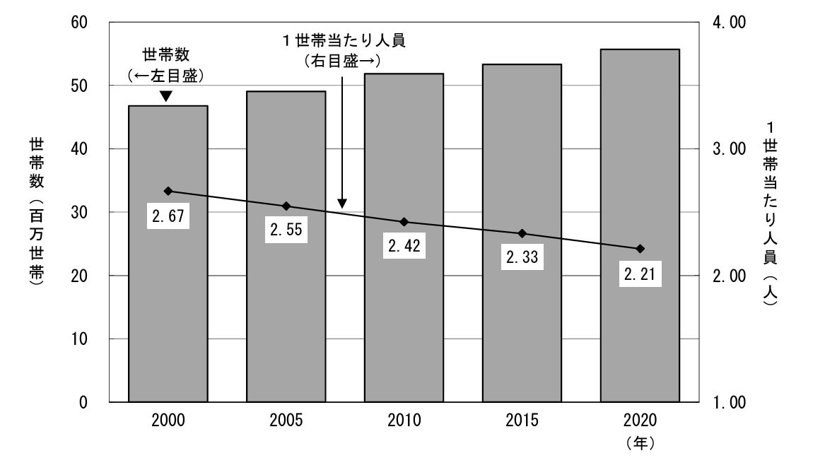 世帯人員は減少傾向(引用元:令和2年国勢調査 人口等基本集計結果)