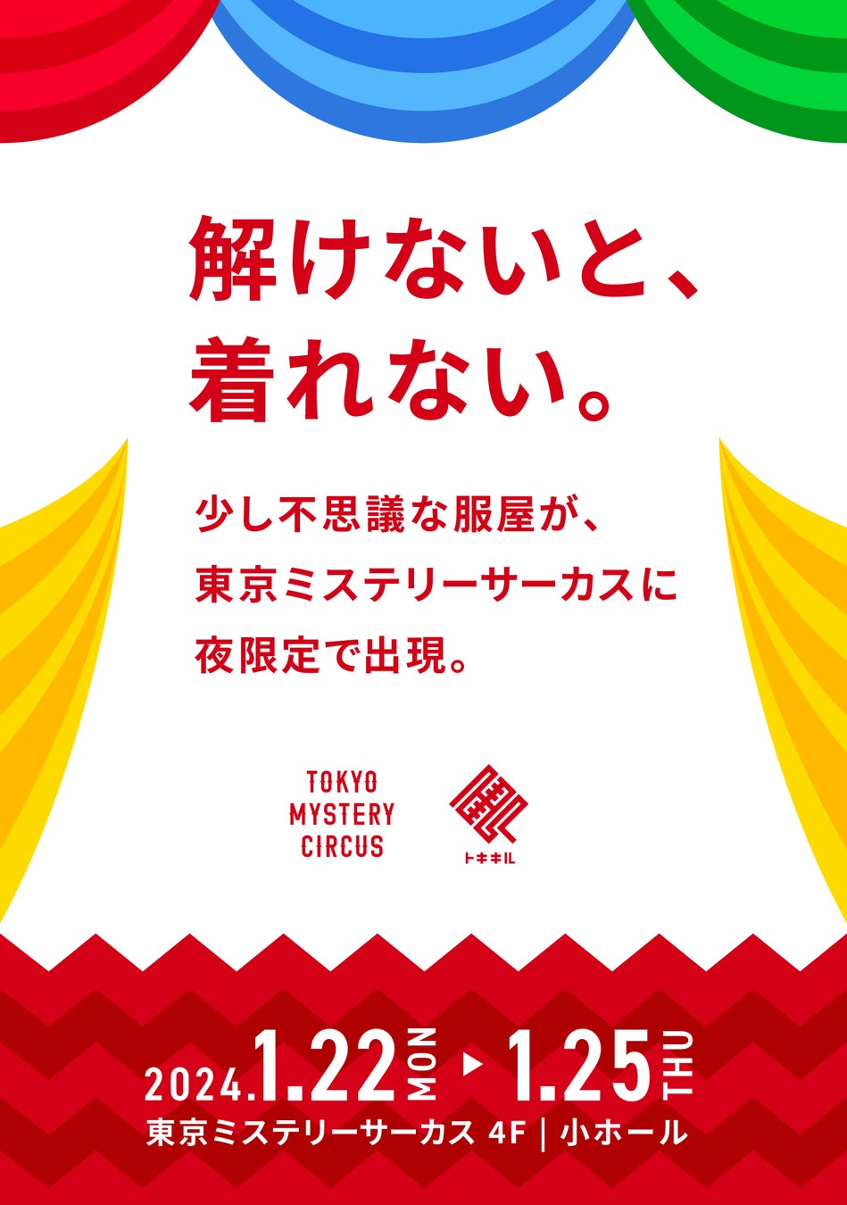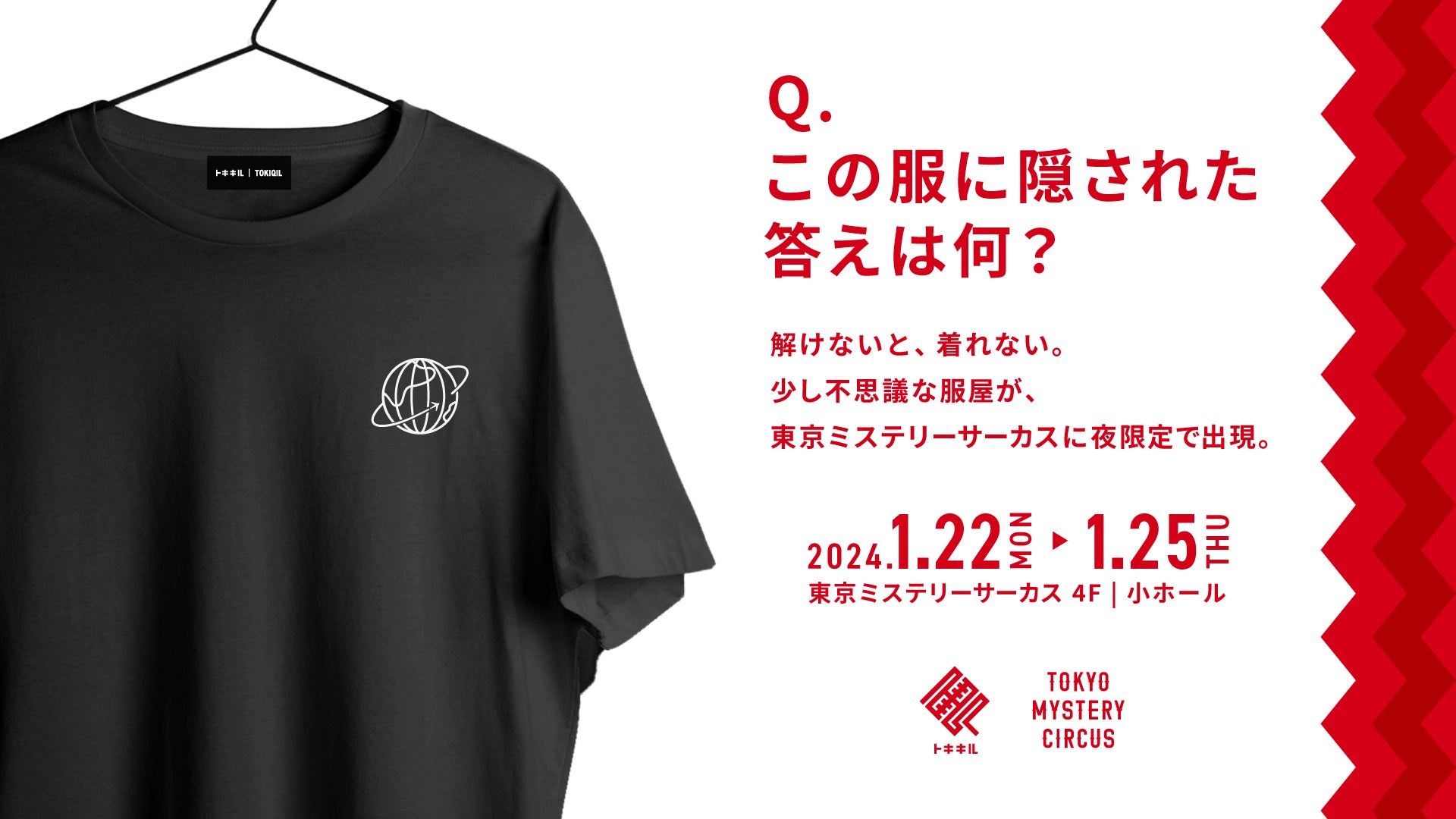 服に隠された謎を解かなければ買えない、謎解き専門アパレルブランド「トキキル」。東京ミステリーサーカスにて、夜だけひらく服屋さんとして期間限定でオープンします。