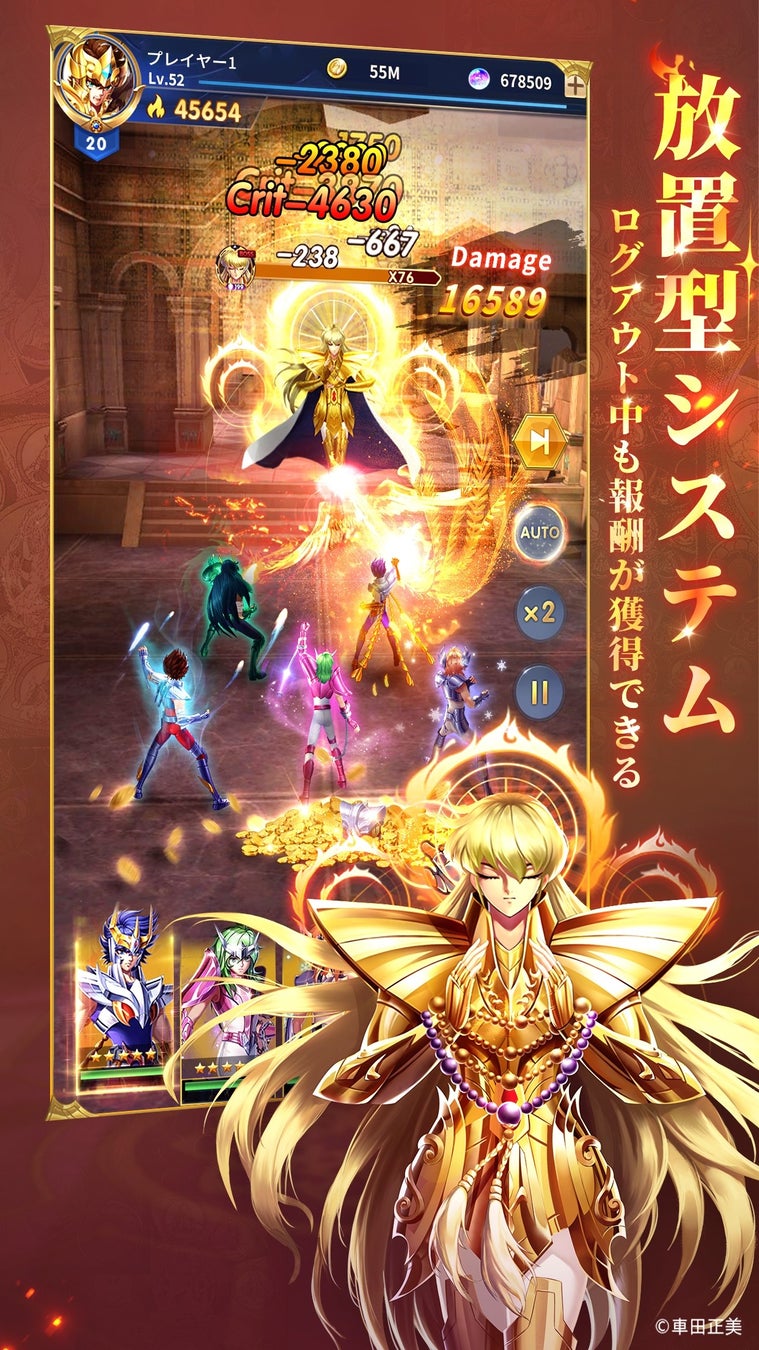 本作の特徴である「放置成長」と「オートバトル」は、プレイヤーを気軽に冒険へスタートさせてくれます。“星のメモリー"や“共鳴石"、“闘士EXP"などの多数のゲーム内アイテムは、放置していても自動的に収集されるため、簡単に聖闘士を強化できます。さらにオートバトルにより、細かい操作を必要としないので、ゲームがそれほど得意ではないプレイヤーの方でもまったく問題ありません。あの「ペガサス流星拳」や「廬山昇龍覇」などキャラがもつ様々なスキルの組み合わせによって最強の聖闘士チームを作ることも本作の魅力の1つです。