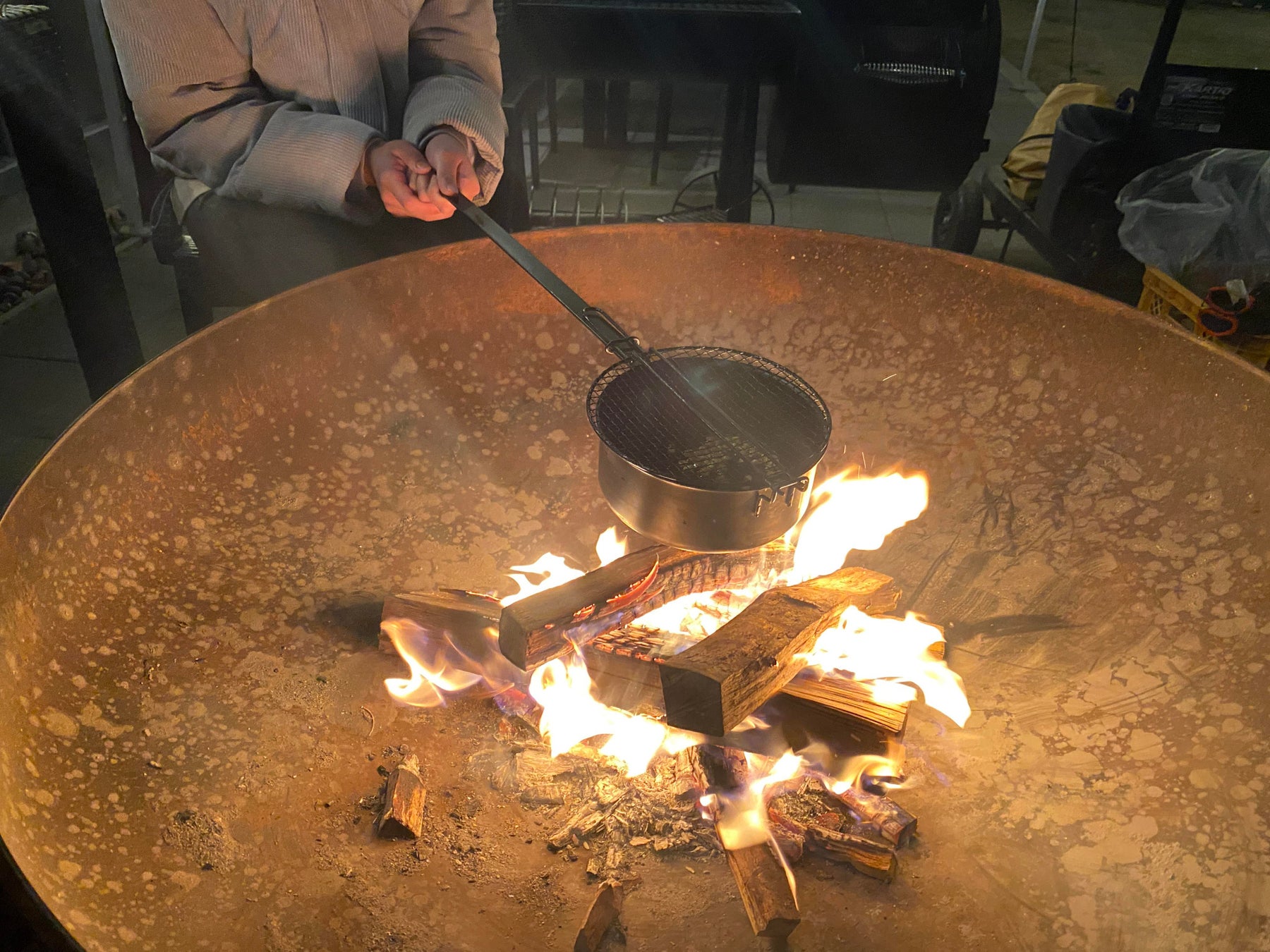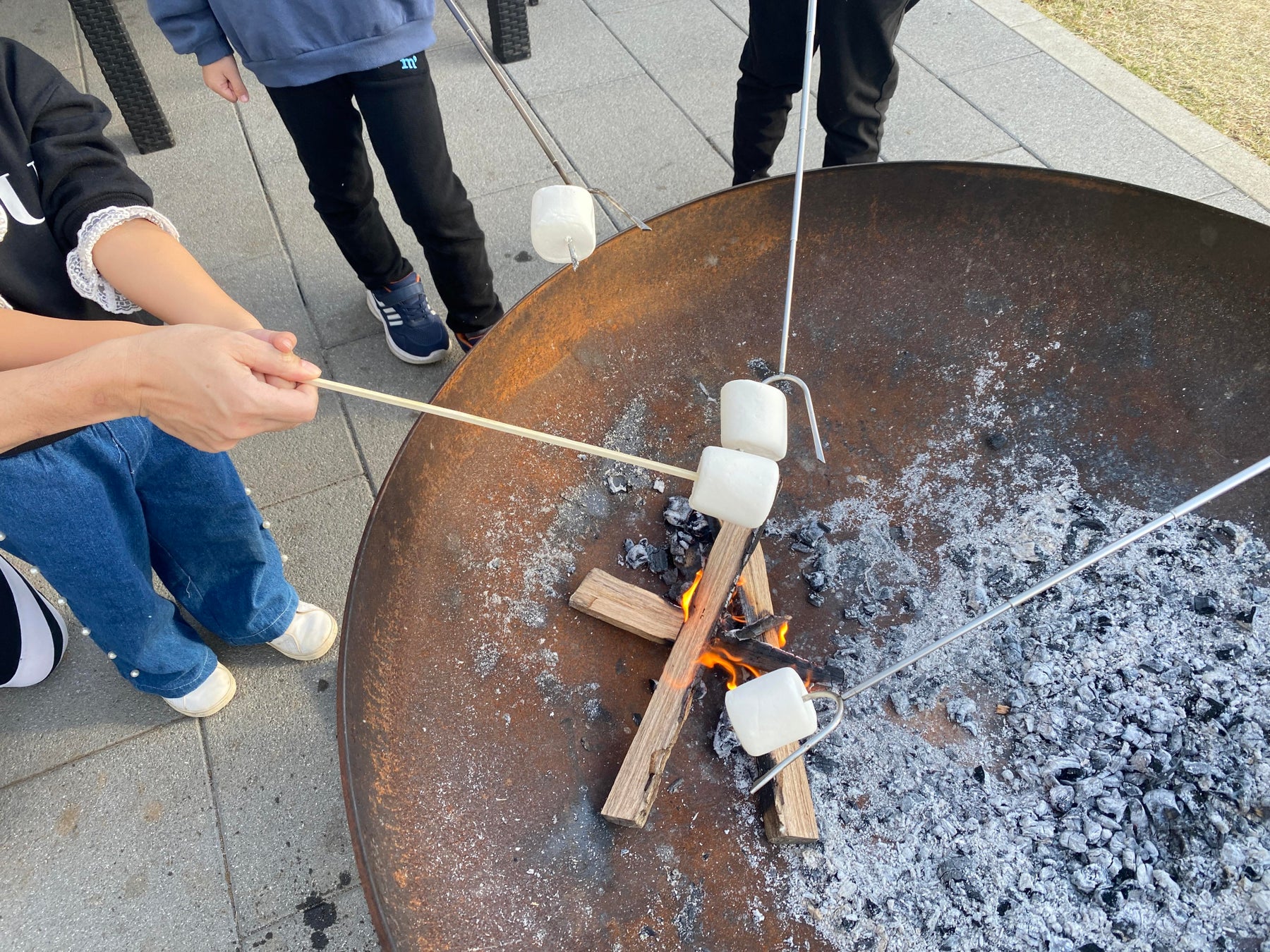 自分で点けた火で炙るマシュマロやソーセージ、野菜。