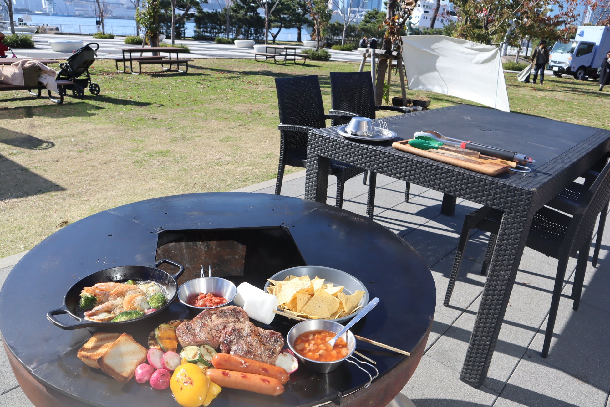 冬季限定、焚き火で楽しむFIRE SIDEさんとのコラボGRILLプラン。レインボーブリッジ、東京湾を一望できる晴海ふ頭公園で、都会の景色と焚き火を見ながらお食事が楽しめる、非日常的な特別プランです。お食事は焚き火を使用して調理いただけます。