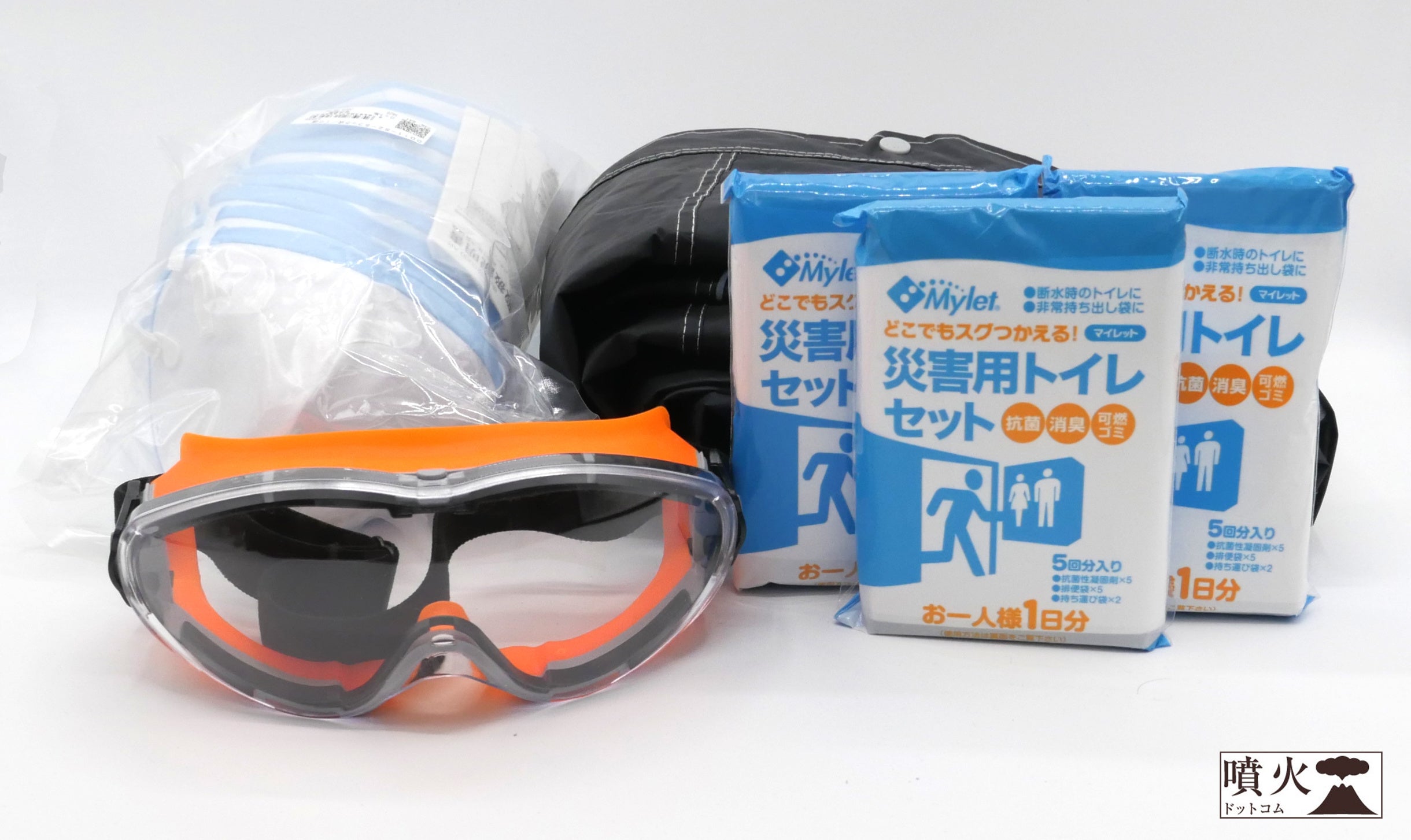 火山灰対策のマスクやゴーグルなど、噴火発生後に降り続く火山灰の中で通勤・通学・買物など生活上最低限の行動に必要な防災用品をセットに。