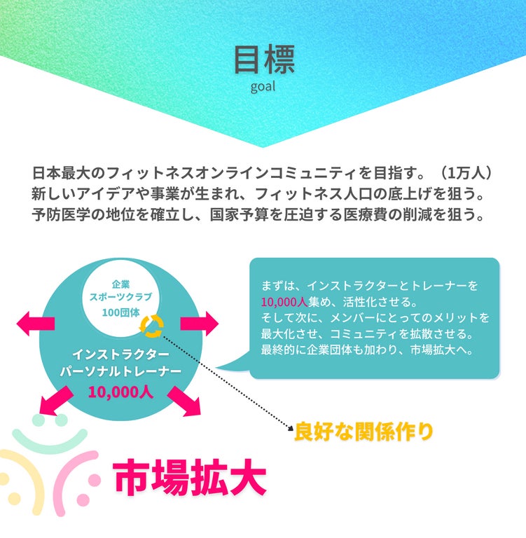 現在フィットネス市場は5,000億円と言われております。加えて、フィットネス人口は4%ほどであり、欧米に比べて低い水準を停滞しております。フィットネス市場を1兆円、そしてフィットネス人口を10%にする為には、今までにない新しい取り組みが必要です。「AI時代」に入り、健康やWell-Beingの価値はより一層高まる事が予想され、年間45兆円に上る医療費も限界と言われる中、人が人の健康を作る社会の実現の為に、健康最前線にいるパーソナルトレーナー、フィットネスインストラクターの活躍の場を広げ、異業種とのコラボレーションを推進していく事が僕たちの最大の目標です。
