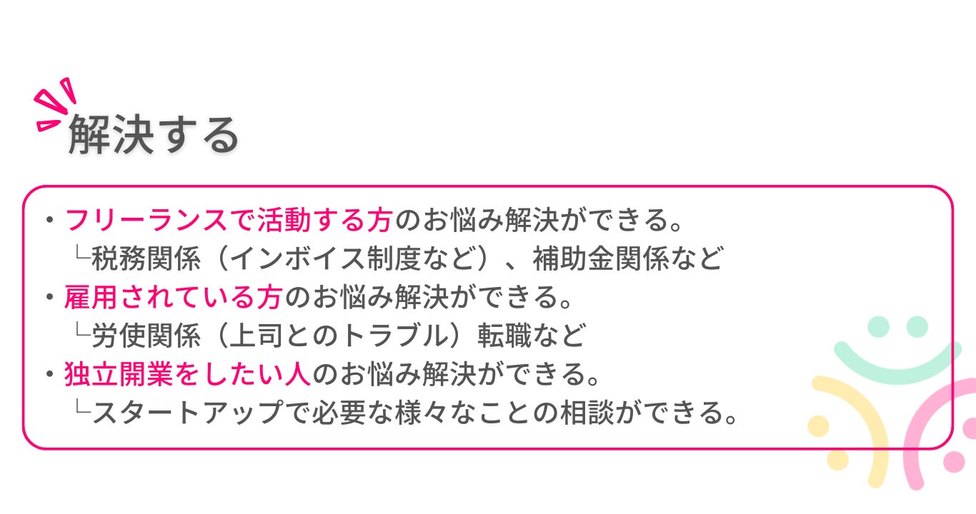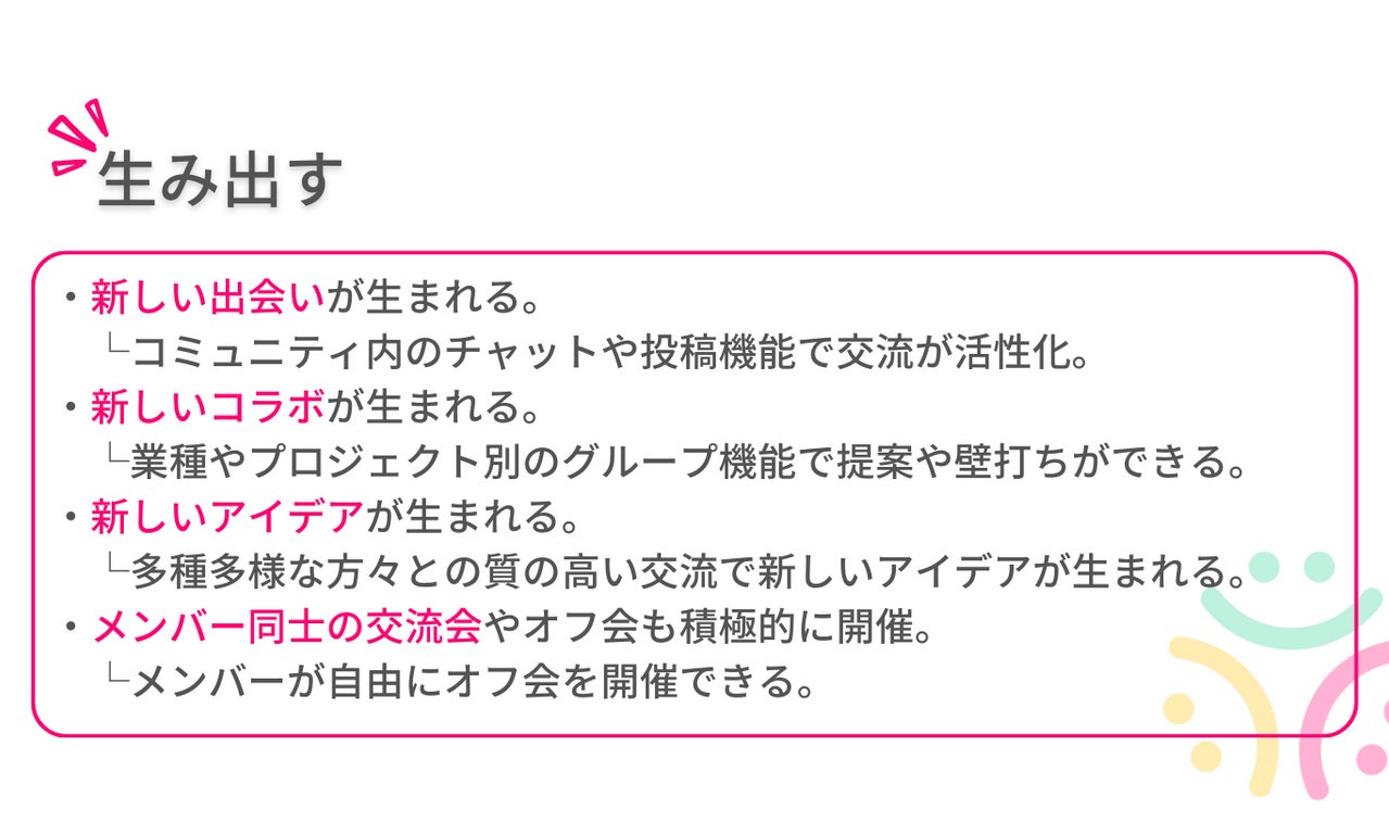 業界内外の専門家の皆さんと共に切磋琢磨ができるというメリットに加えて、日頃の課題を見つけ出して解決できたり、コミュニティを通して知り合った人とコラボできるといった質の高い出会いがあるのも大きなメリットです。