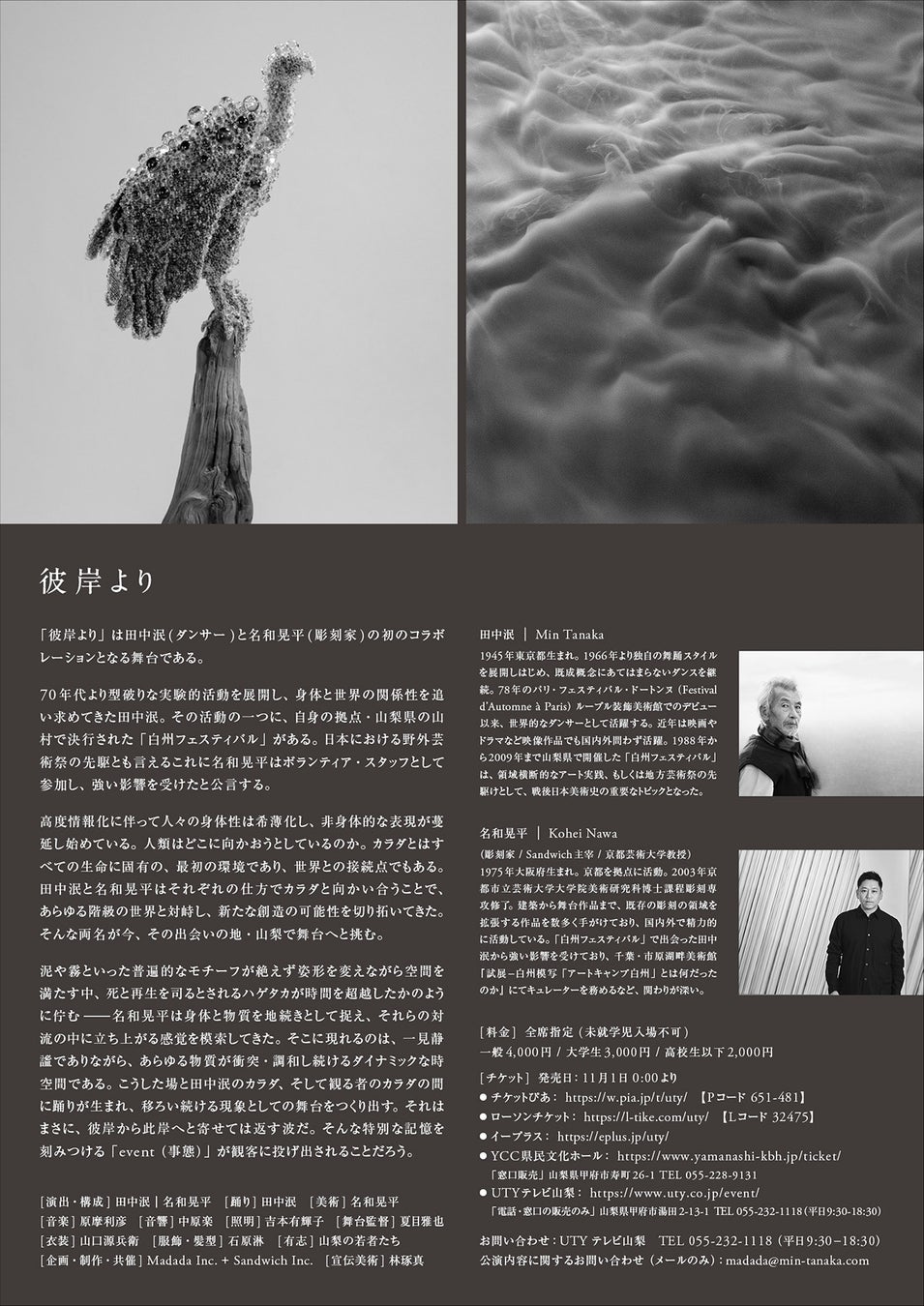 彫刻家 名和晃平とダンサー 田中泯の初のコラボレーションとなる舞台『彼岸より』を、YCC県民文化ホール(山梨県民文化ホール)にて上演いたします。