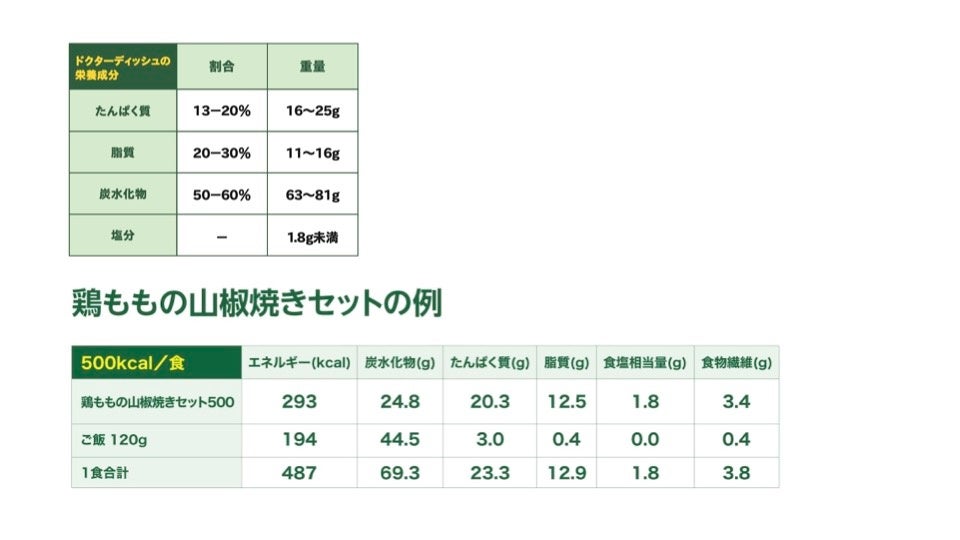 「Dr. Dish」は、タンパク質、脂質、炭水化物を厚労省の目安に準拠するとともに、塩分値を1.8g未満にするなどの医療現場での栄養指導の基準に適った栄養設計でありながら、旨味・コク・深みを十分に感じられる「おいしさと満足感を両立」させる製品を実現しています。