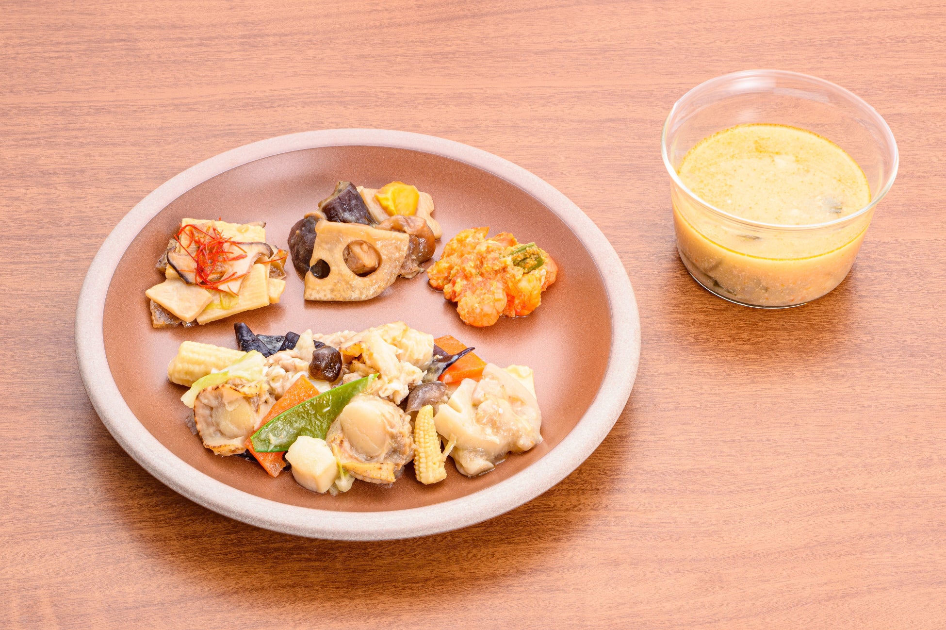 特に硬い食感がない麻婆茄子に、こんにゃく・クコの実・松の実を少量トッピングすると、咀嚼時間が38%延伸。異なる食感の食材を組み合わせることで咀嚼時間を延ばすことが確認されました。