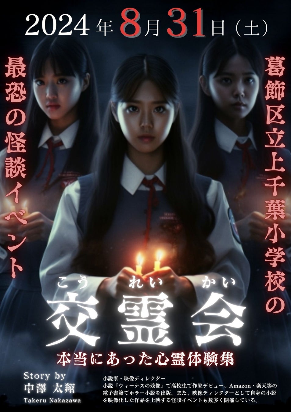 怪談イベント「交霊会」はこれまでに千葉と東京で2回開催された。今回は、葛飾区立上千葉小学校のPTAの企画・全面協力により、初めて小学校の体育館を貸し切る形で大規模に開催した。