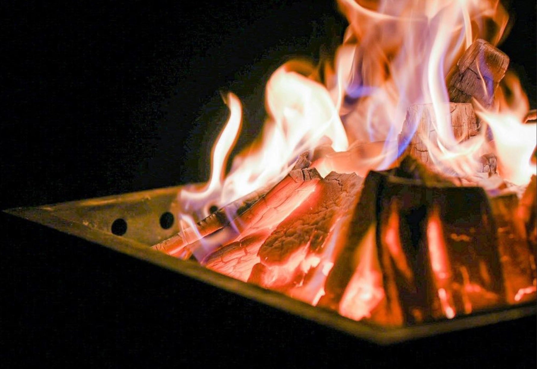 これにより、「太い薪でも簡単に火がつく(火おこしが簡単)」「煙が少ない」「二次燃焼特有の美しい炎」などの従来の二次燃焼ストーブのメリットはそのままに、直火に近い自然な焚き火が楽しめる、理想の焚き火スタイルを実現。