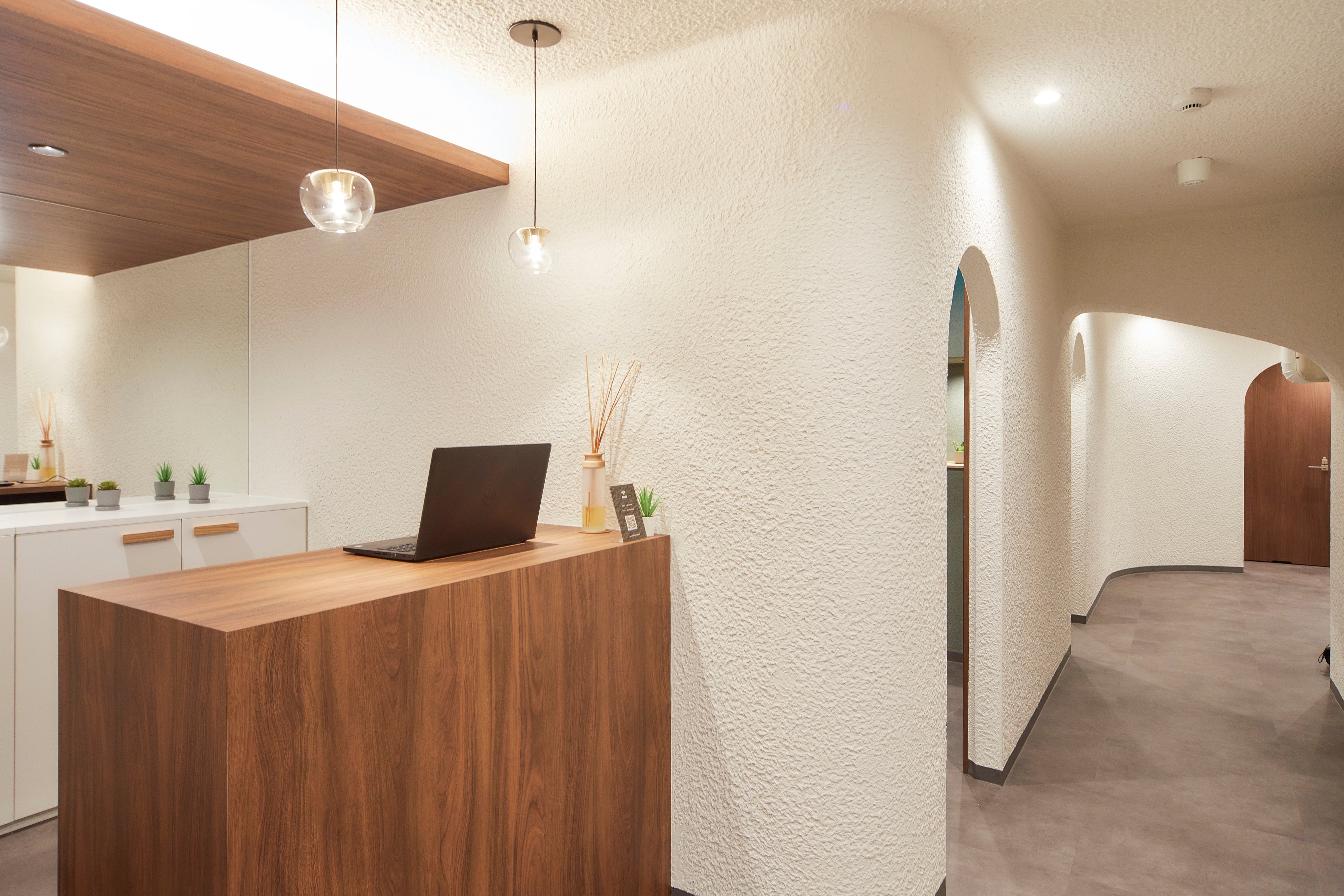 洞窟をイメージした隠れ家のような空間で、心満たされるヒーリング体験を。木や珪藻土などの自然素材を多く取り入れ、コンパクトなスペースながら自然体で落ち着くことのできる空間をつくりました。