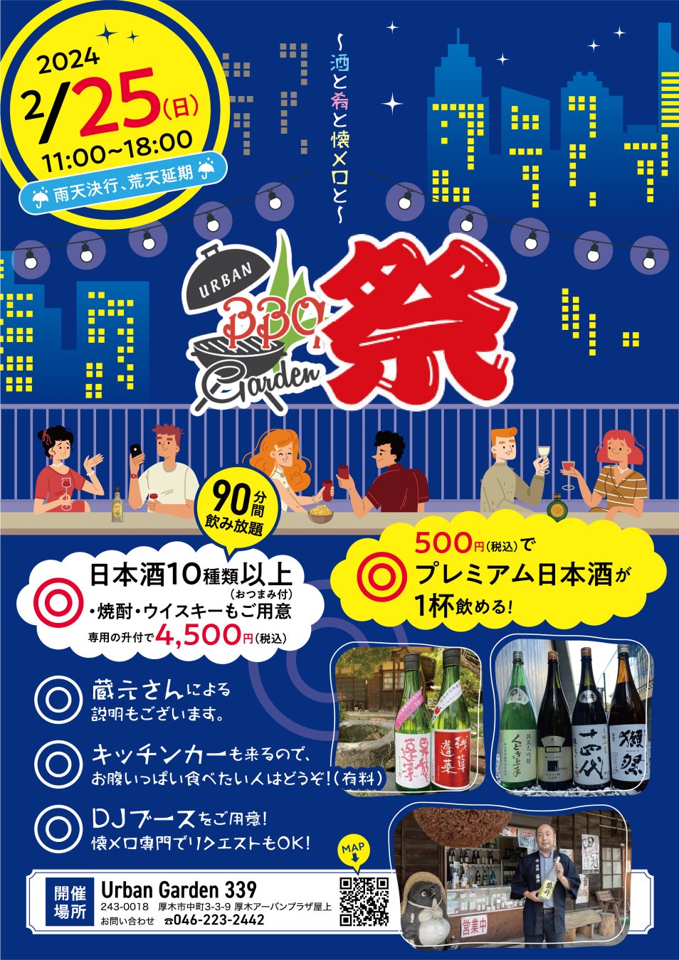 Urban Garden 339は、本厚木から徒歩3分の厚木アーバンプラザ屋上にBBQスペースとして2023年5月オープン。イベントやレンタルスペースとしての顔も併せ持ち、企業様の懇親会、貸し切りイベントなどにもご利用いただいています。今回は日本酒を味わい親しみながら懐かしく楽しいひとときをお届けします。