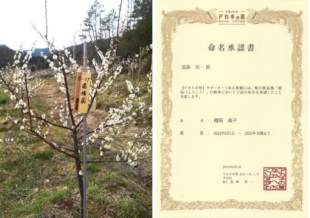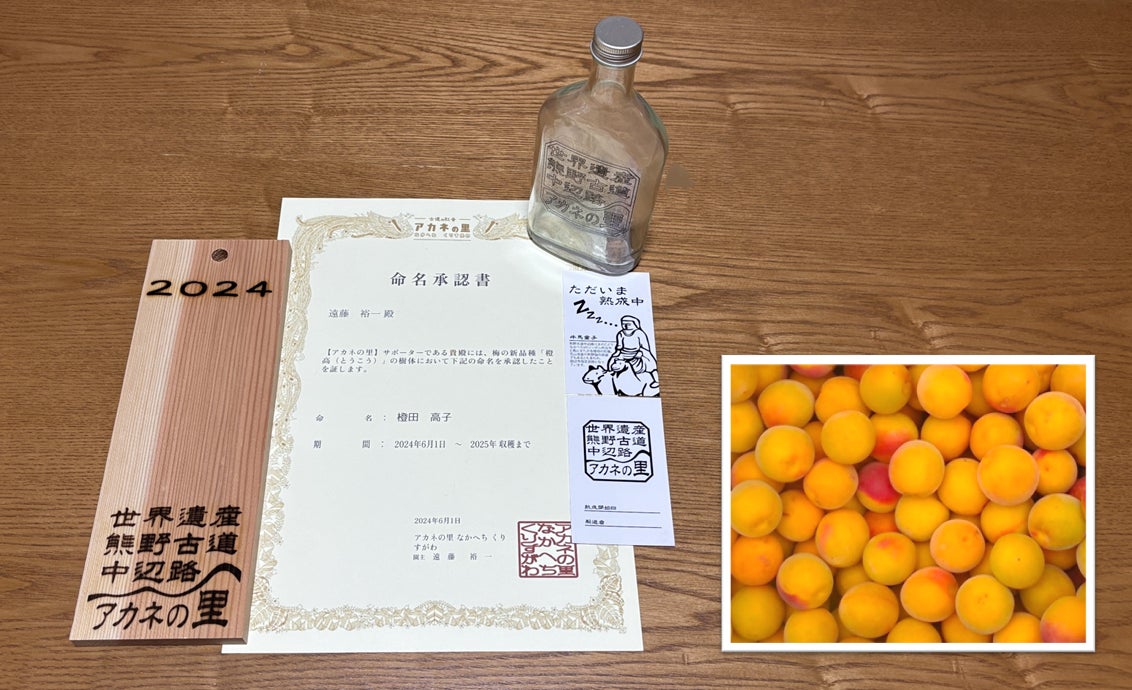 2018年に大手メーカーが数十キロのみを販売し、瞬く間に売り切れた幻の梅「橙高(とうこう)」。和歌山県の世界遺産「熊野古道」のふもとの梅農家、「アカネの里」では、この橙高を露茜(真っ紅になる新品種ウメ)の受粉を助ける目的で植えている。加工などの利用を考えていなかった橙高が、実は農家も驚く美味しさだった。橙高は和歌山県でしか栽培されていない限定品種であり、栽培実績が少なく、市場に出回らないため幻の梅と言われている。現在、栽培している農家も少なく、このままでは市場で知られないまま消えてしまう!幻の梅「橙高」を守り、品質の良さを広め、栽培する農家を増やしたい。アカネの里では幻の梅を守るため、「橙高の梅酒や梅シロップを自宅で簡単に作ることができる手づくりキット」と、「アカネの里にある橙高の樹体に名前を付けてもらい、収穫までサポーターとなる【命名サポーター】」の募集をクラウドファンディングサイト「Makuake(マクアケ)」にて開始。募集期間は2024年1月15日(月)から2024年2月28日(水)