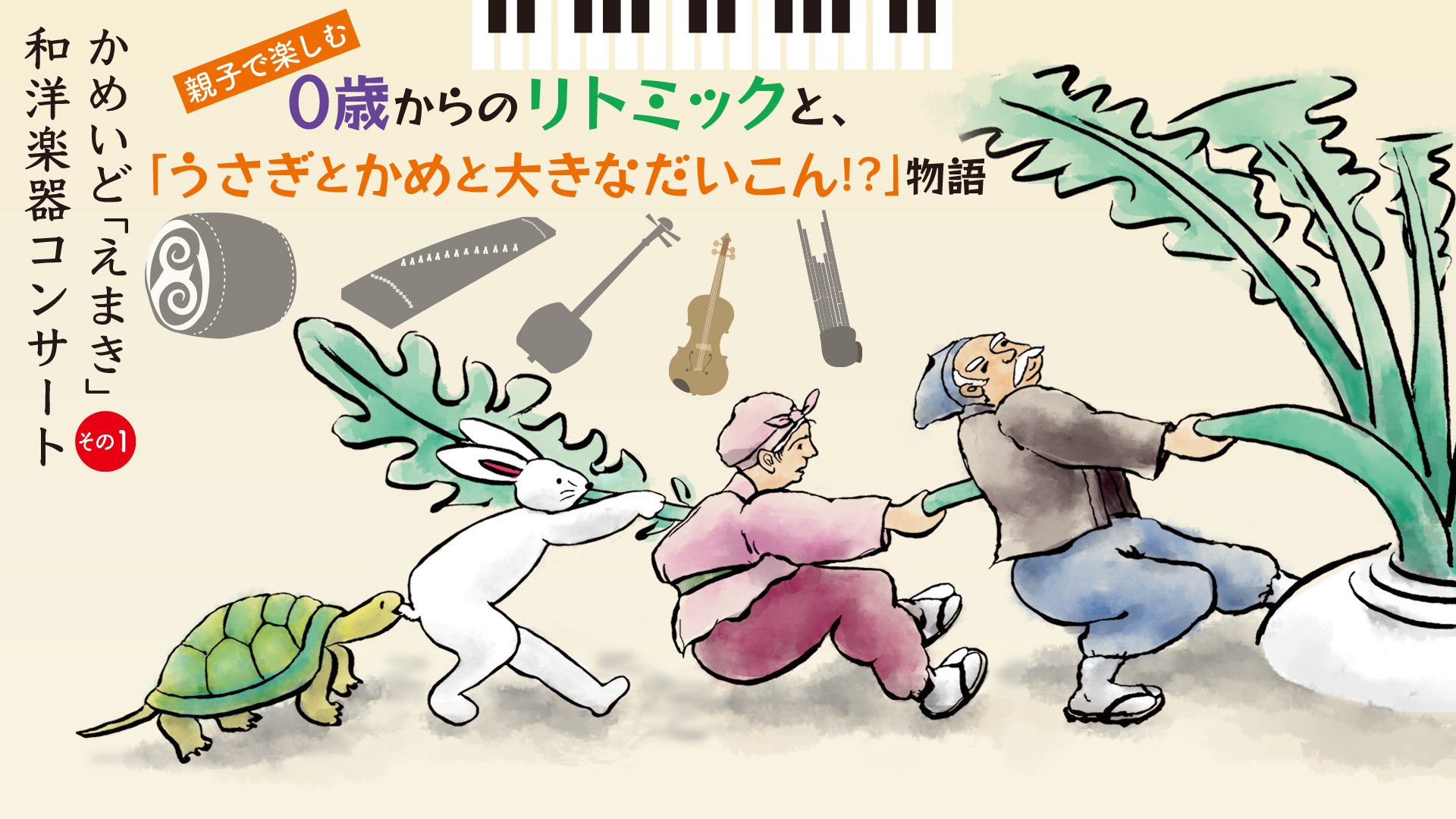 親子で楽しむ参加型リトミックコンサートで、子どもたちに親しまれる物語「うさぎとかめ」と「大きなかぶ」を題材として、亀戸流にアレンジしたストーリー「うさぎとかめと大きなだいこん!?」を中心に、リズムに合わせて身体を動かし、会場と一体になって舞台を創る体験をします。(3mの大きなだいこんも登場します!)
