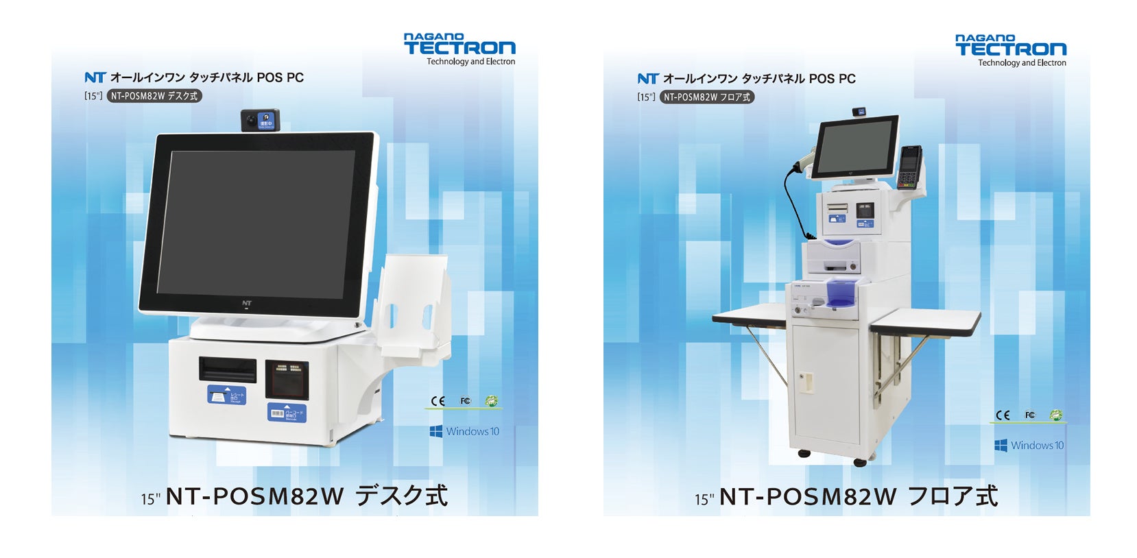 タッチパネルPCは当社の最新機種「NT-POSM82W-J641」を採用。デスク式やフロア式など、ニーズにあわせた形状にカスタム製造も可能です。