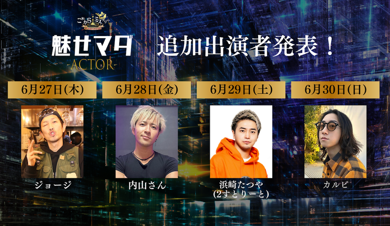 マーダーミステリー舞台「魅せマダ~ACTOR~」はプロの役者が即興芝居で演じる舞台です。台本なしセリフなしであらかじめ用意されているのは配役の設定のみ。キャストが舞台上で役になりきりながら、時間内に犯人を見つけるべく議論を重ね、推理を行う新感覚ミステリー舞台が開催されます。