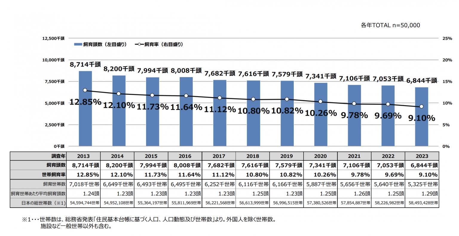 2023年時点の日本国内での犬の飼育頭数は約684万頭、世帯飼育率は約9.10%と推計されています。(一般社団法人ペットフード協会調べ)