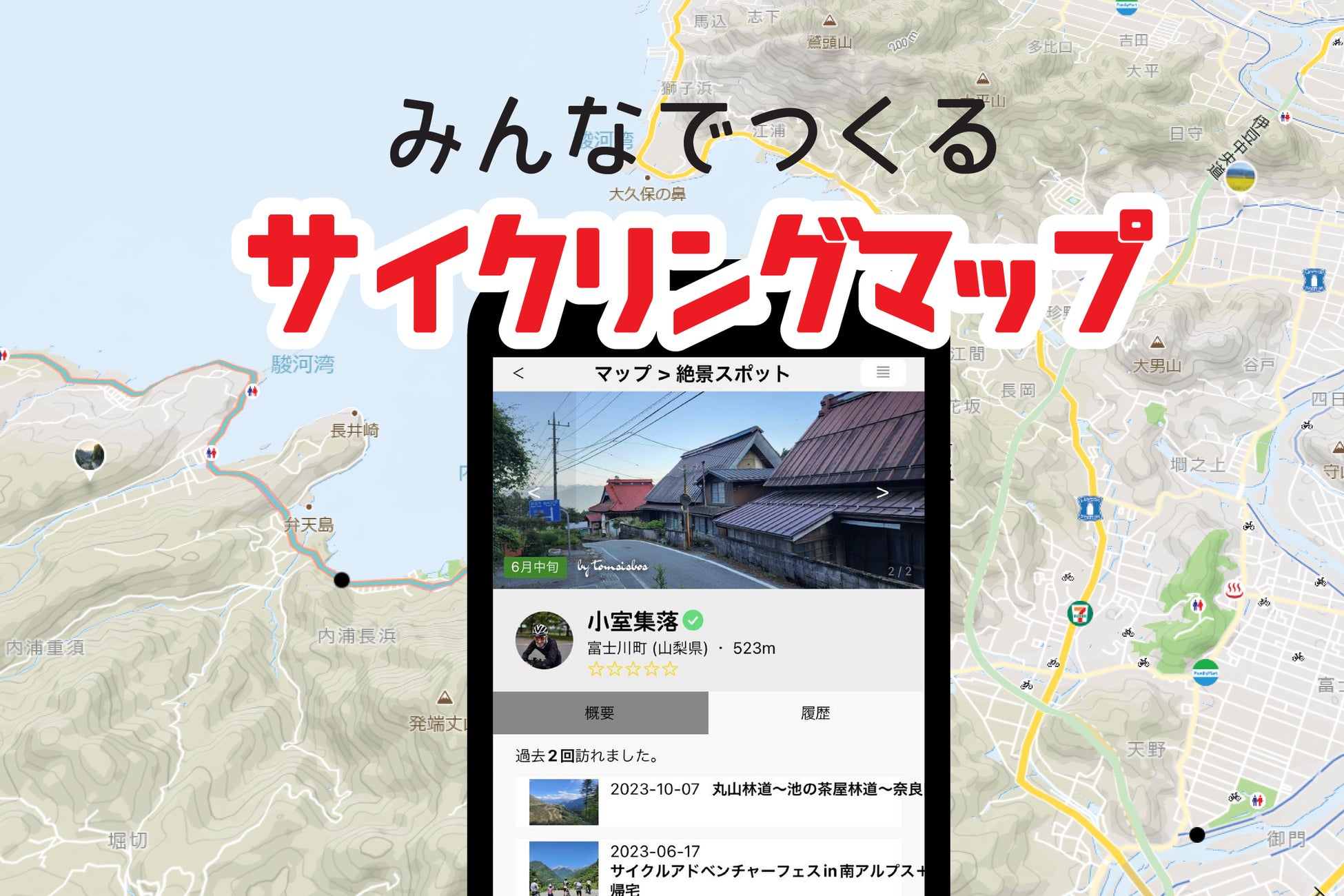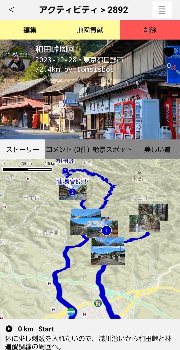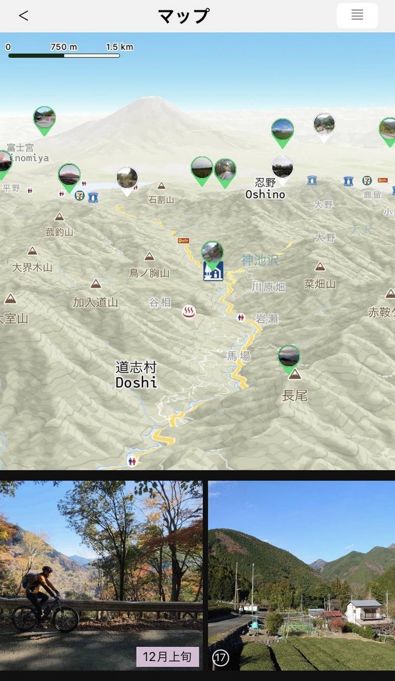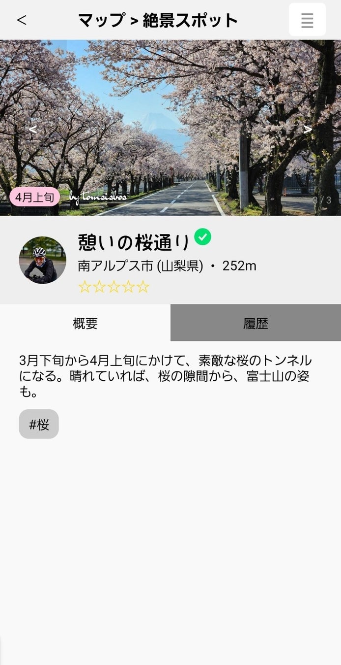 記録したGPSデータに写真と文章を足し加えることで、共有できるページが自動作成されます。このデータを用いて、新規「絶景スポット」を作成したり、走行中に通過したルート、施設や絶景スポットを評価したりすることができ、統計データと合わせてサイクリングマップに反映されます。
