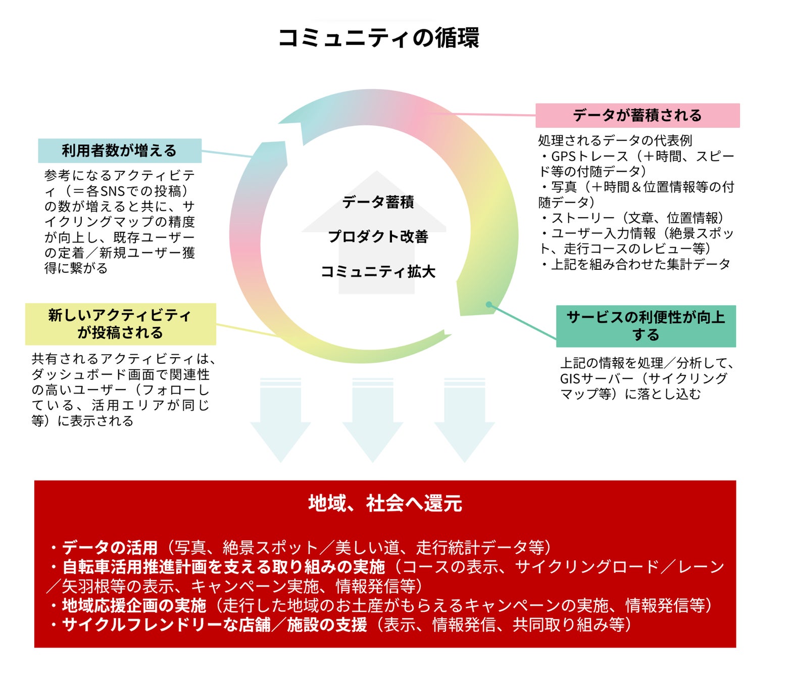 当面は、サイクリスト向けのプロダクトを磨き上げ、ユーザーベースの拡大を目指していくことに合わせて、自転車活用推進計画を推進している合計230の地方公共団体(47都道府県と183地方自治体)に対してニーズ調査を行い、行政向けのプロダクトを設計していきます。