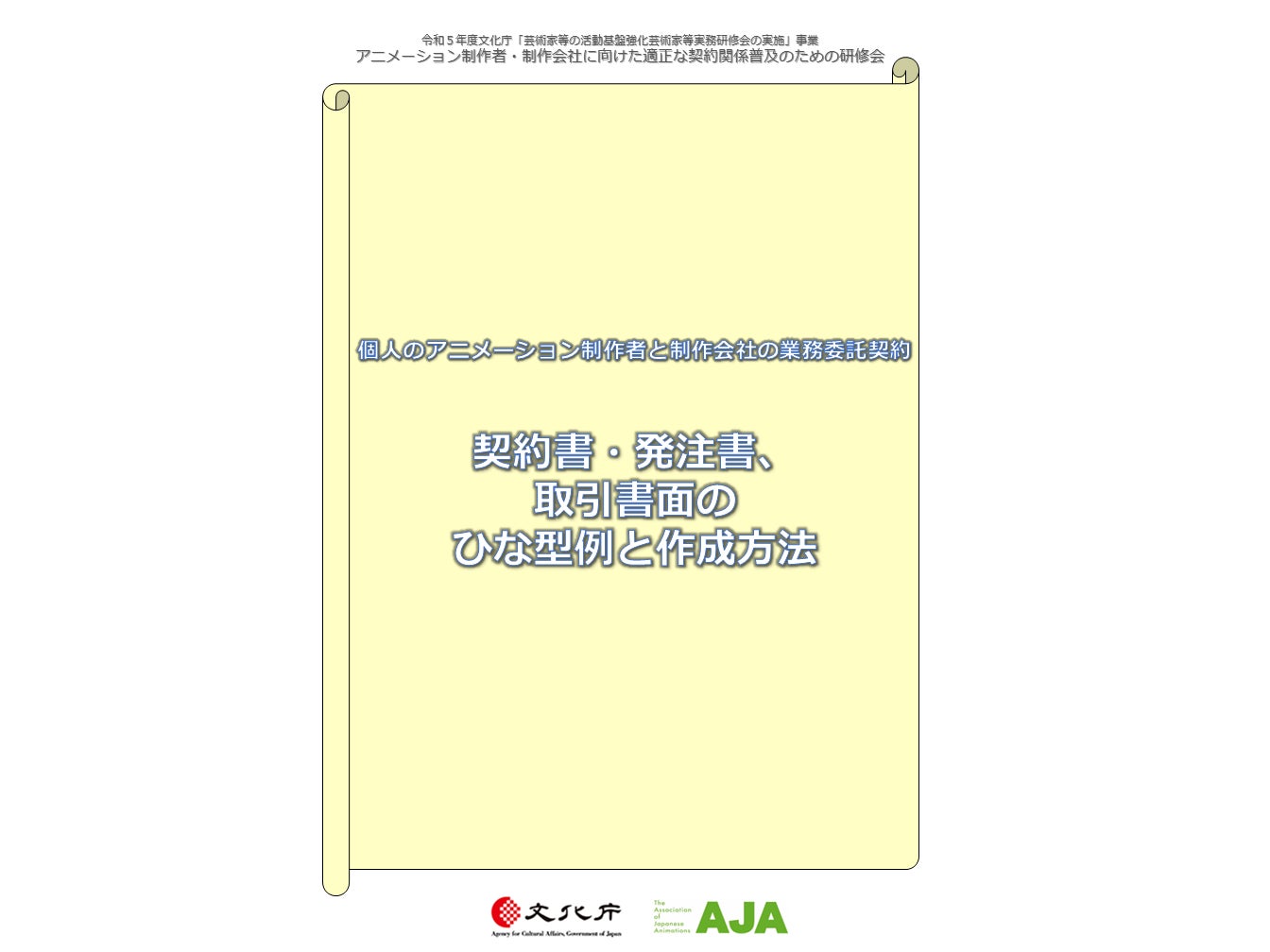 令和4年7月に文化庁が公表した契約書のひな型や解説等を含んだ「文化芸術分野の適正な契約関係構築に向けたガイドライン(検討のまとめ) 」に基づいて、アニメーション制作に共通の基本の契約と、代表的な職種の個別の業務の契約について、法律の適用もふくめて解説する研修会を開催します。この事業は、令和5年度 文化庁「芸術家等の活動基盤強化芸術家等実務研修会の実施」事業です。