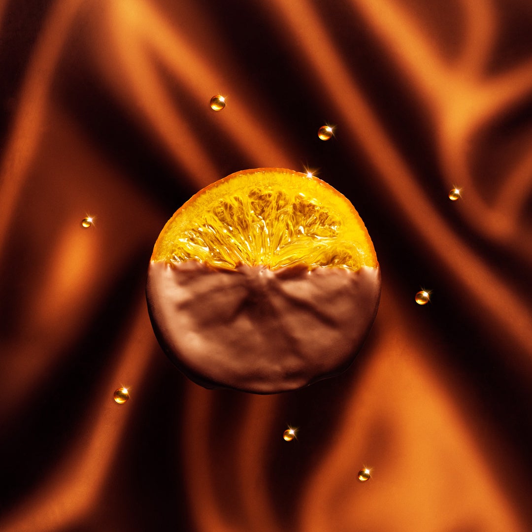 和歌山県産の「春峰(しゅんぽう)」とショコラトリーモランの「セントゥールドプロヴァンスバジリック」を合わせたオランジェット。果肉感ある食感とキラキラした美しさ、南仏を思わせるバジル香るチョコレートの個性あふれる1枚です。(※阪急限定商品)