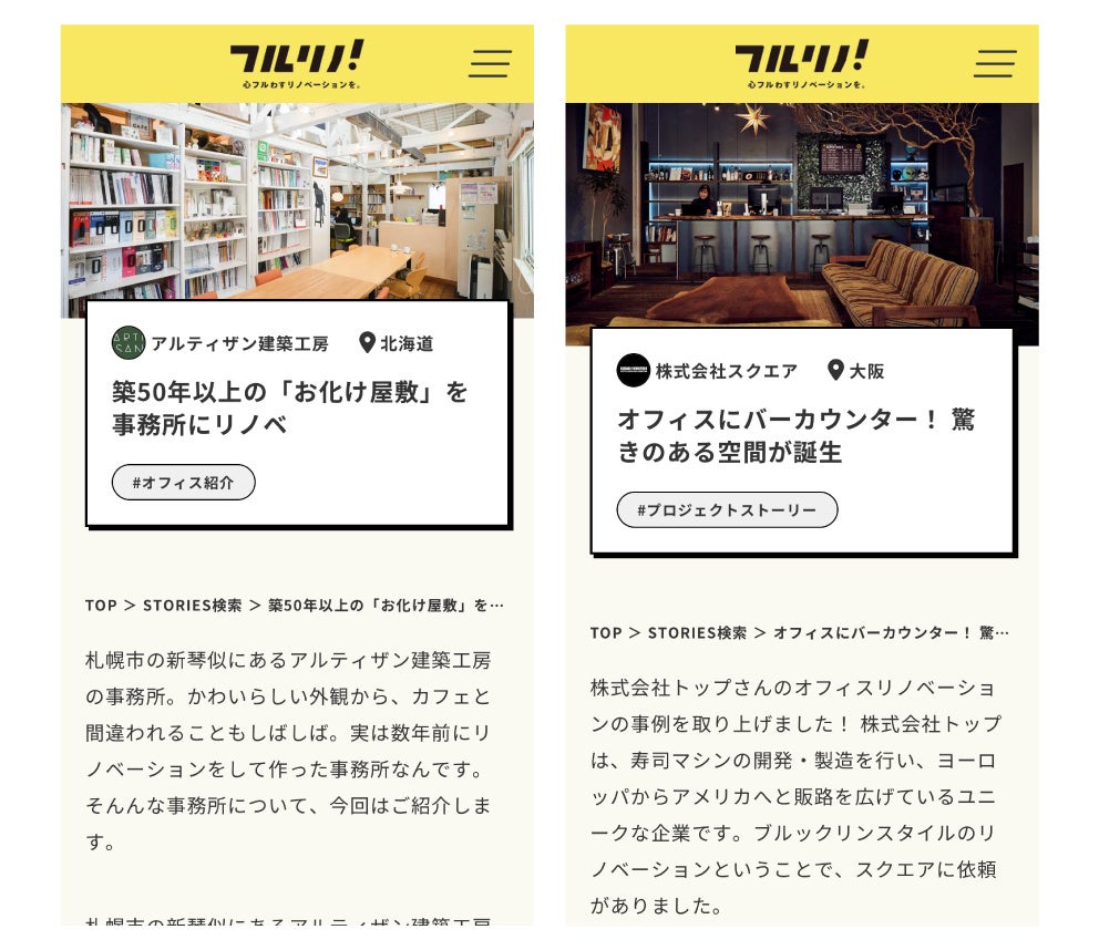 「フルリノ!」に登録しているリノベーション事業者による記事を掲載しています。過去のリノベーションについての詳しいエピソードや、空間づくりへのこだわり、経営者の紹介など、様々な切り口で書かれているので、より深くリノベーションのことや各社について理解することができます。