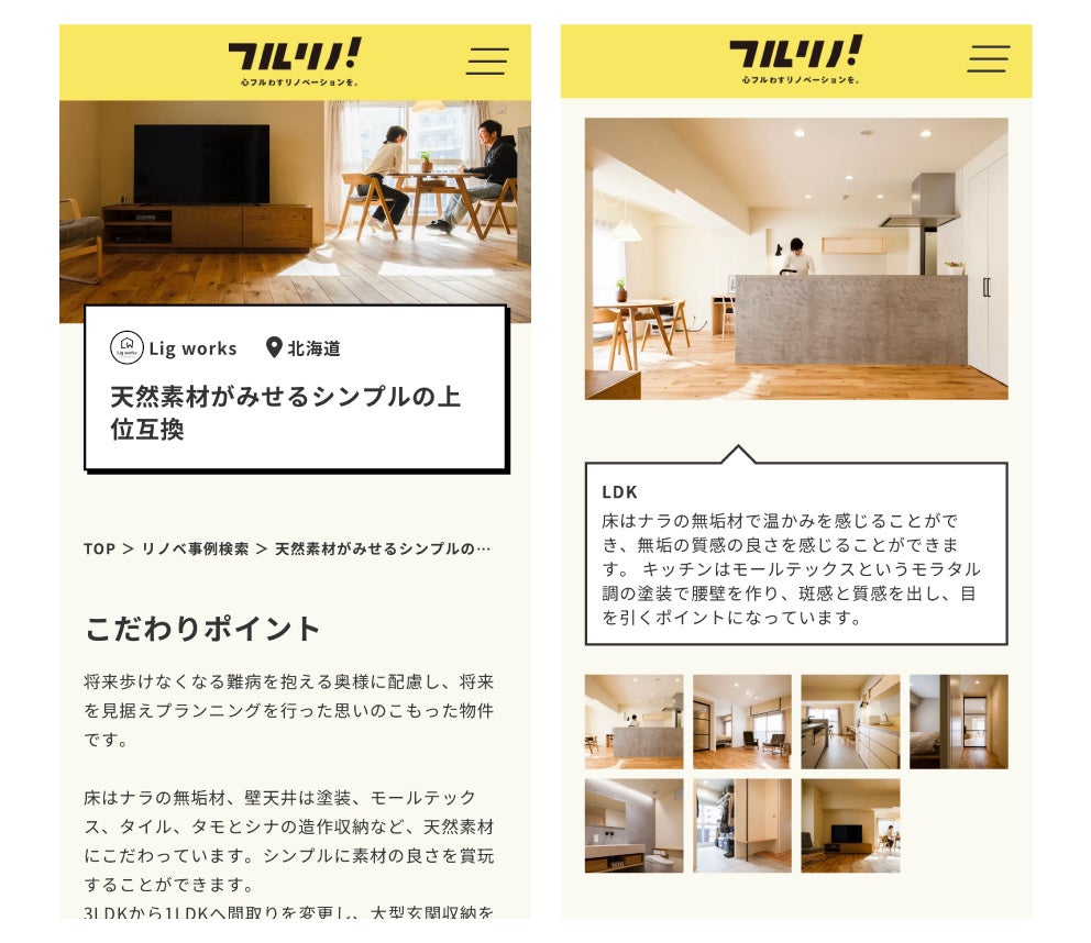 「フルリノ!」では、これからリノベーションをしたいと考えている人に役立つ情報や、リノベーション事業者の魅力が深く伝わるコンテンツを用意しています。また、今後もさらにコンテンツを拡充させる予定です。