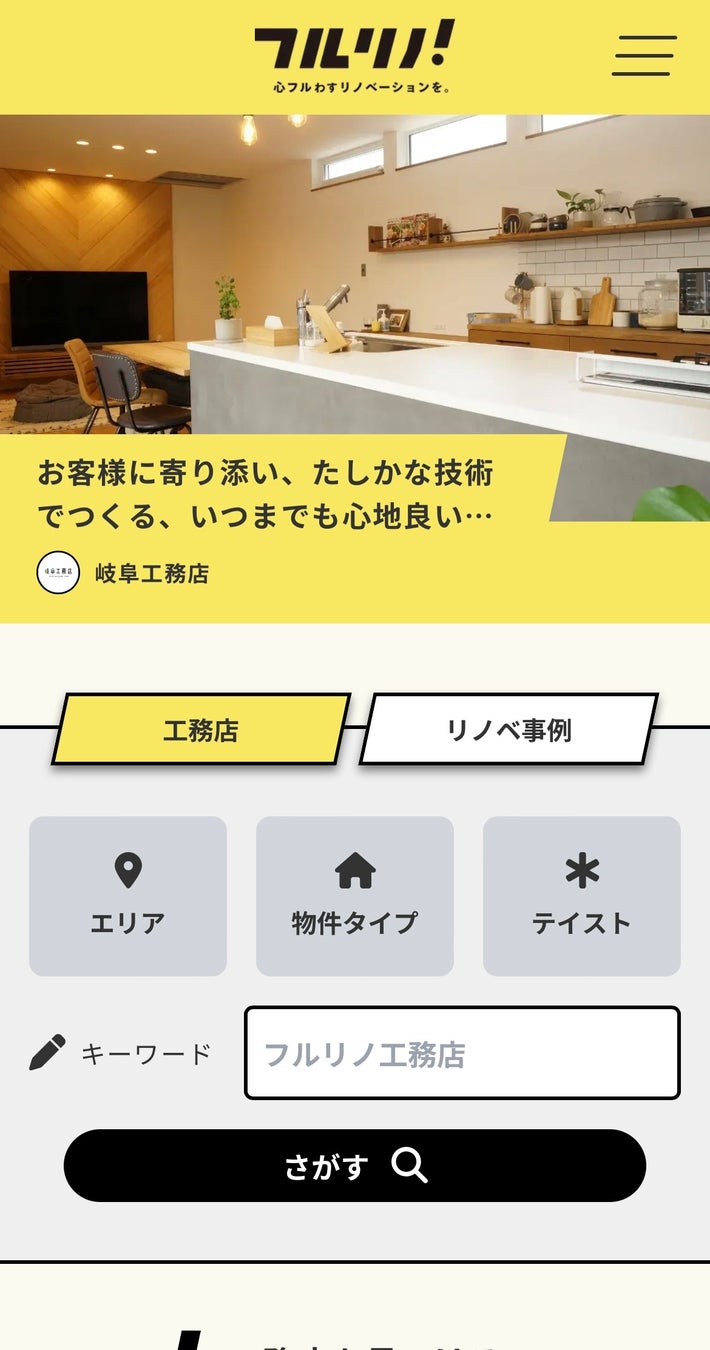 「フルリノ!」は、日本に数あるリノベーション事業者の中から、特に高品質で優良な事業者の情報を集約したポータルサイトです。その中から、リノベーションをしたい人が自由に工務店を探し、依頼や問い合わせをすることができます。