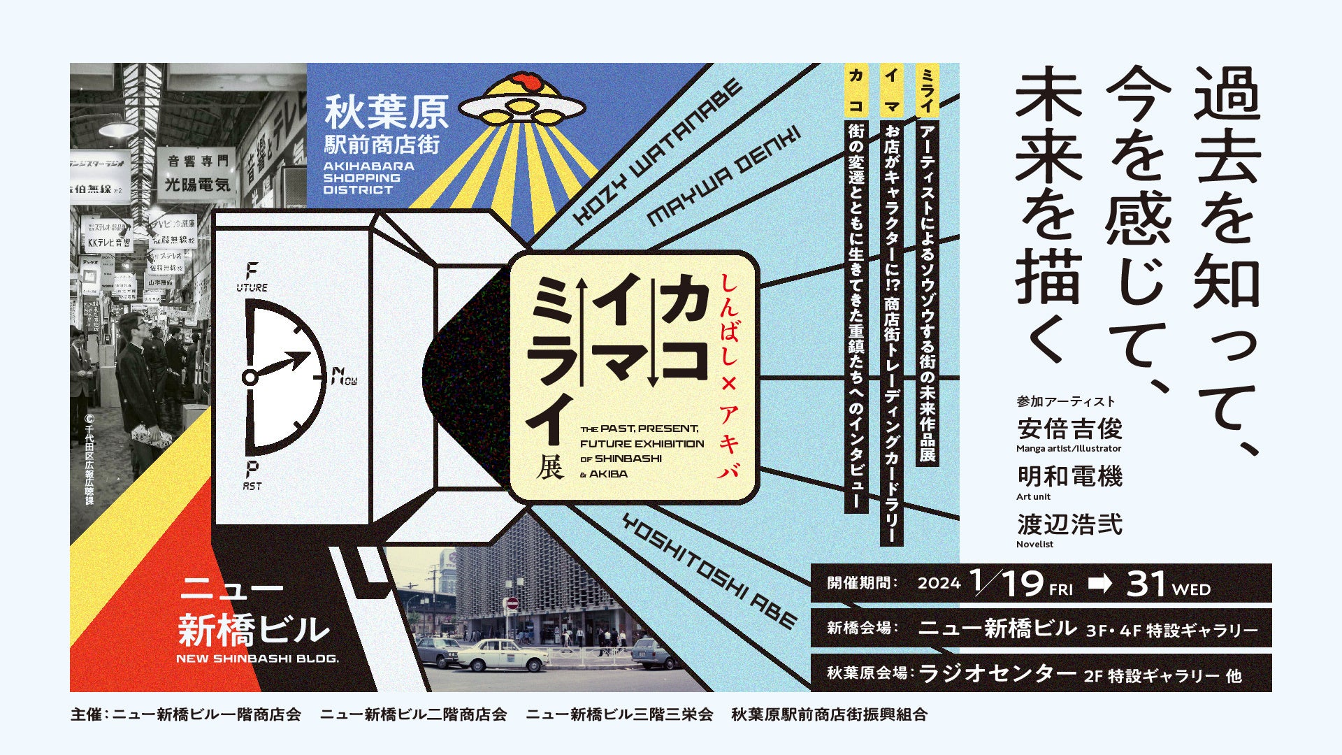 カコ↓イマ↑ミライをテーマに、ニュー新橋ビル商店会(東京都港区)と秋葉原駅前商店街振興組合(東京都千代田区)が合同で、2024/1/19(金)~2024/1/31の期間において、特設会場での展示を実施いたします。
