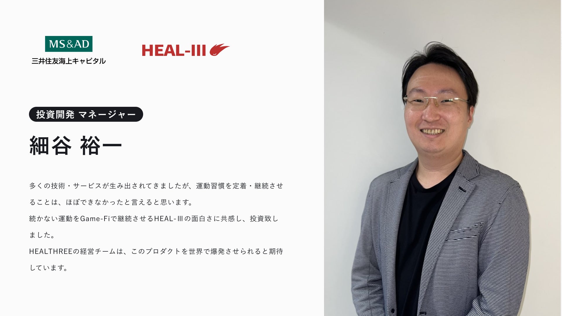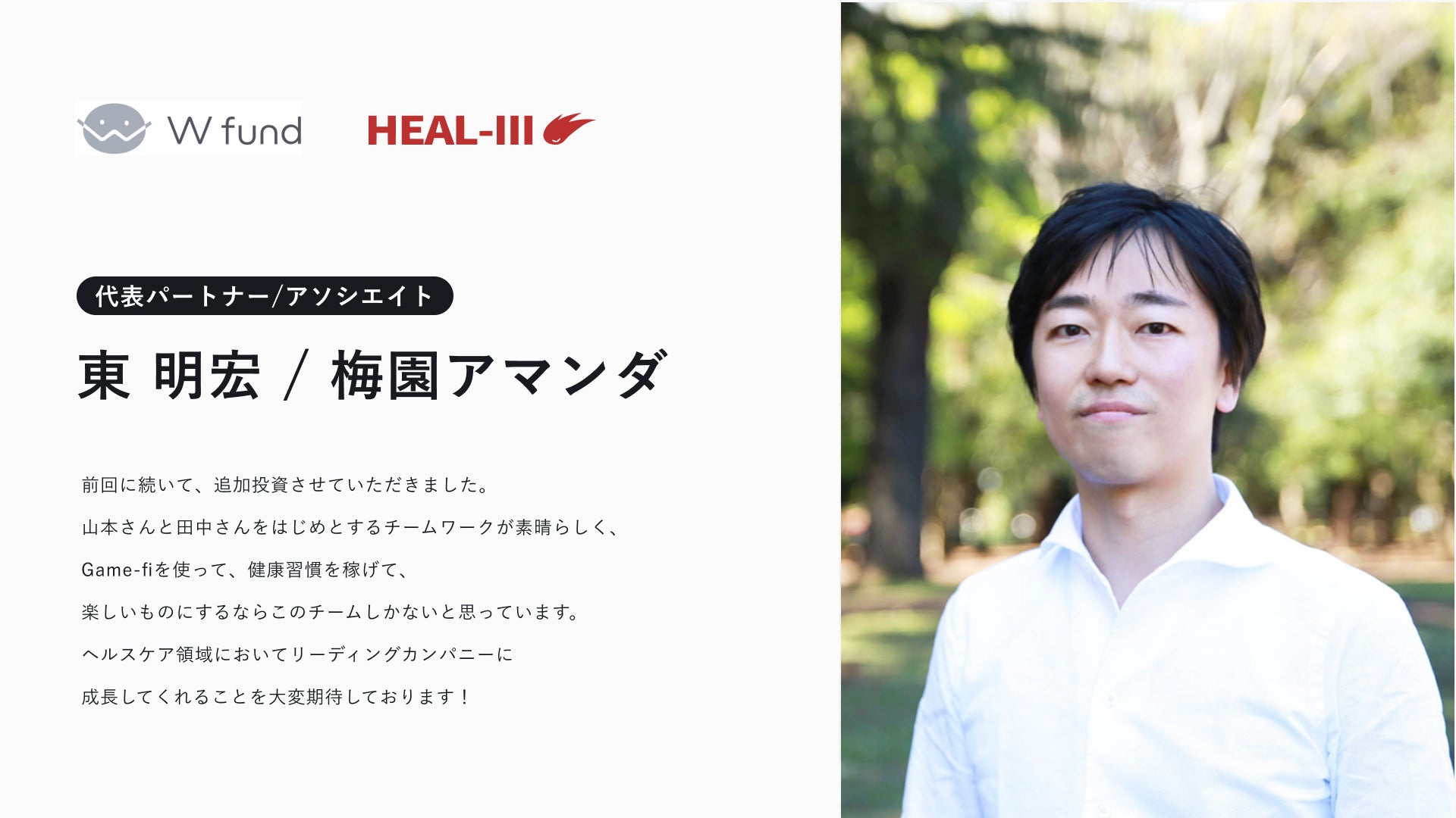 今回の資金調達により、「HEALTHREE」を基盤とした経済圏の構築における、基盤アプリの実装及び更なる機能拡充、またトークン上場や上場後のサステナブルな成長における体制構築を行います。