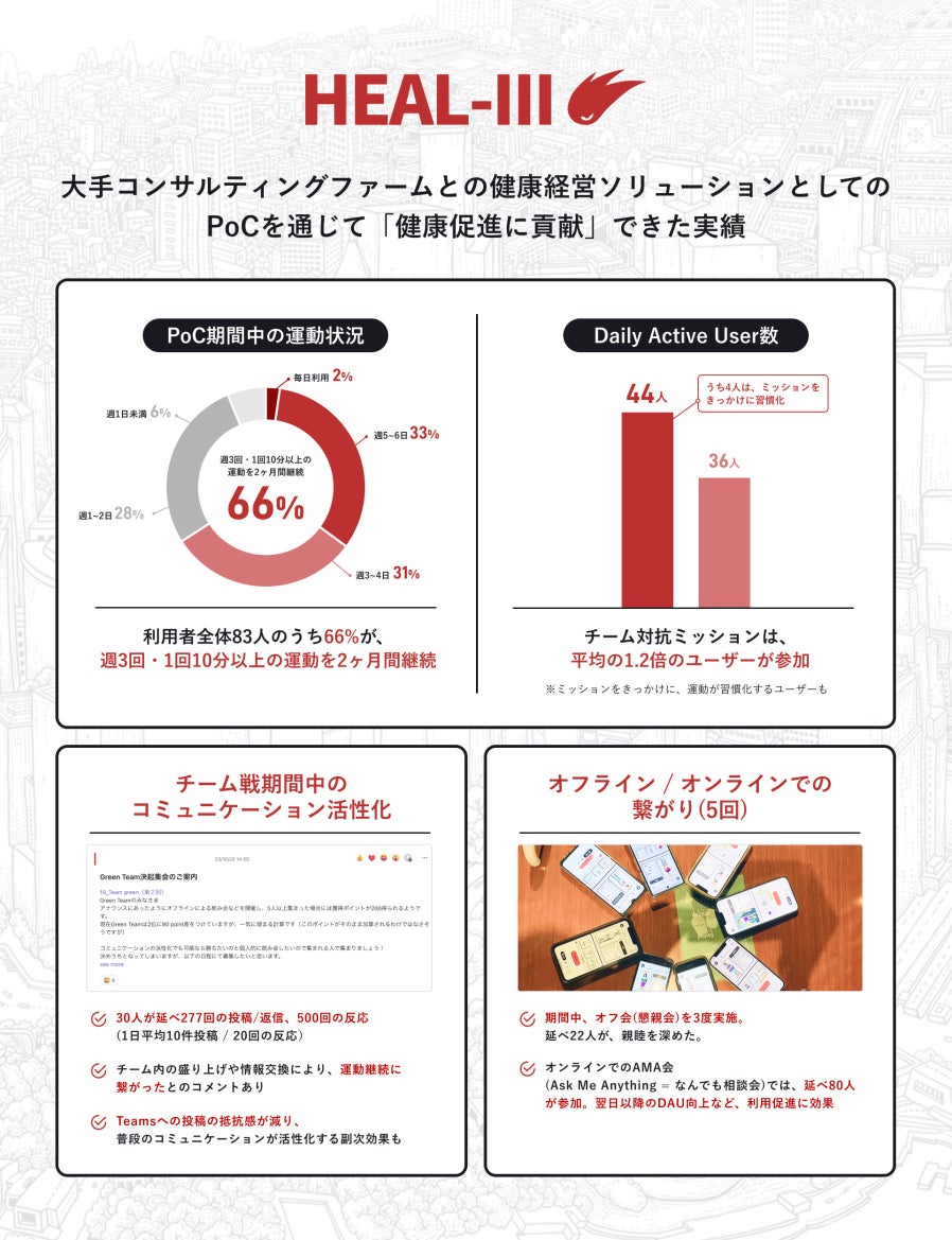 過去行った大手コンサルティングファームとのPoCにおいても既存の健康経営サービスと比較してもより高い成果が出ており、今後益々成長を加速させていく予定です。