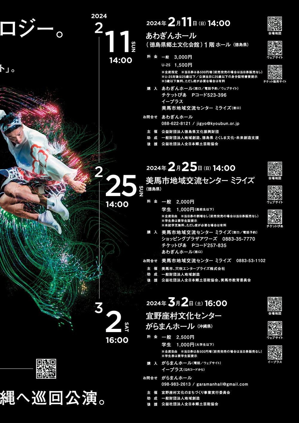 徳島の阿波おどり、沖縄のエイサー、そしてコンテンポラリーバレエのそれぞれの演舞に、XRテクノロジーをとりいれたこれまでにない舞台演出が、あらたな風流を生みだす。