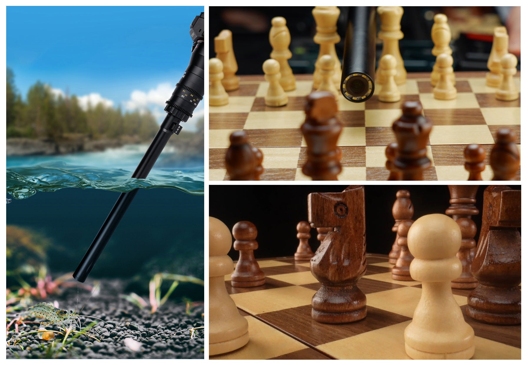 ・90°のレンズモジュールとダイレクトモジュールを付け替えて様々な角度からの撮影が可能です。手が届かない難しいアングルでも潜望鏡のような視点で簡単に撮影できます。