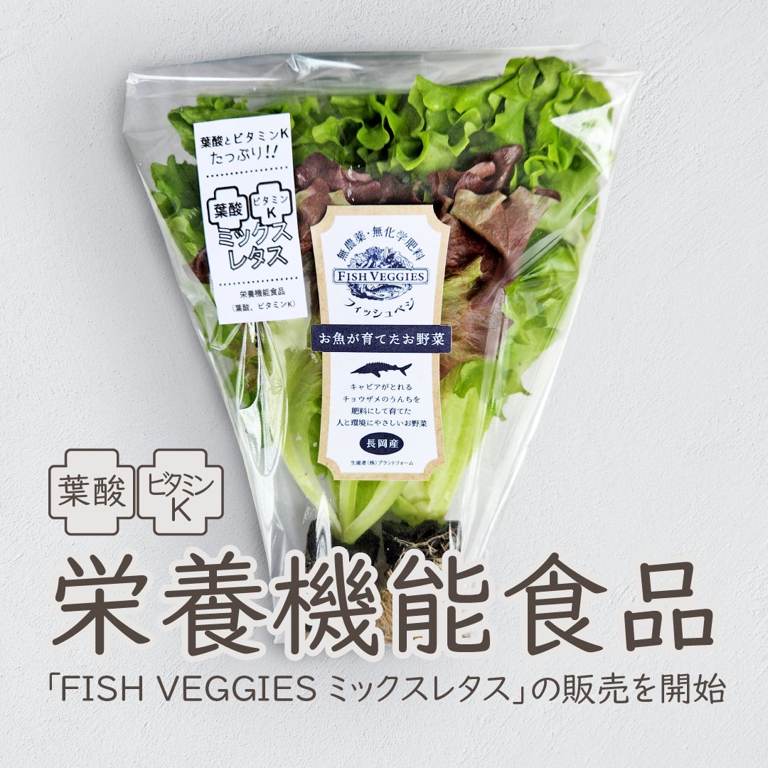 当社のアクアポニックスで栽培したリーフレタスについて、新潟大学と共同(※3)で、栄養・機能性成分について評価を行った結果、アクアポニックスで栽培したリーフレタスには葉酸とビタミンKが季節を問わず安定的に含まれており、栄養機能食品としての基準を満たすことを明らかにしました。アクアポニックスで栽培したリーフレタスが栄養機能食品の基準を満たすことは初めての発見であり、本研究成果を活用し、全国初のアクアポニックス産の栄養機能食品「FISH VEGGIES ミックスレタス」として、2024年4月15日より販売を開始いたします。