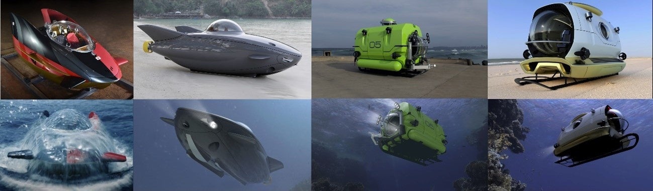 例えば、レジャー用には3人乗りで、最大深度100mのものがあります。イルカ遊泳、宙返り、横転など、従来の潜水艇では不可能な動きを実現しています。また水陸両用で陸から海にそのまま突入し、更には下側がシースルーの設計となっていて海底をそのまま見る事が出来る機種もあります。