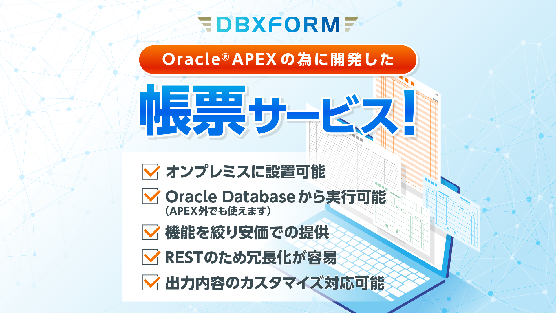 DBXFORMは世界有数のローコード開発プラットフォームであるOracle Application Express(以下Oracle APEX)向けに開発された帳票APIです。サーバー単位での課金制を取り、必要な機能を厳選することで低価格を実現します。Oracle Databaseから直接帳票を生成でき、Microsoft Word・Microsoft Excel・HTML・PDFなどの形式に対応可能と使い勝手がよく、導入しやすいのが特徴です。帳票サーバーはオンプレミスに設置できるので、厳しいセキュリティ要件にも対応できます。帳票の生成はPL/SQLファンクションで実行する為、バッチ処理や画面を介さない帳票生成などにも対応できます。