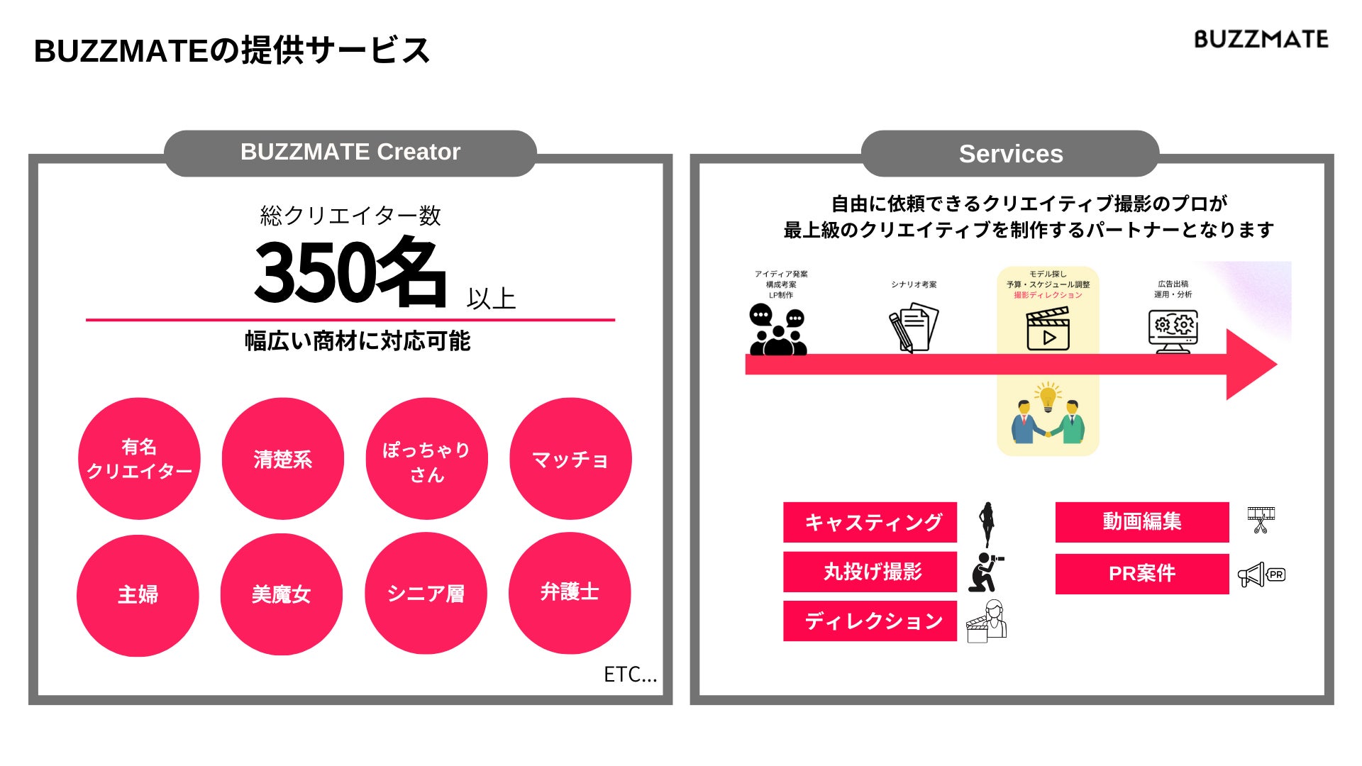 BUZZMATEに登録している350名以上のクリエイターデータベースの中から、各企業が撮影を希望する広告商材にマッチするクリエイターを選定、ご提案いたします。
