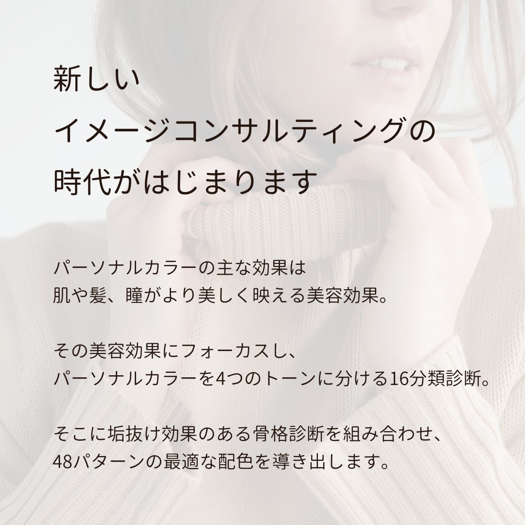 その美容効果にフォーカスし、パーソナルカラーを4つのトーンに分ける16分類診断と垢抜け効果のある骨格診断を組み合わせ、最適な配色を導き出すメソッドがファッションカラー48タイプ診断です。