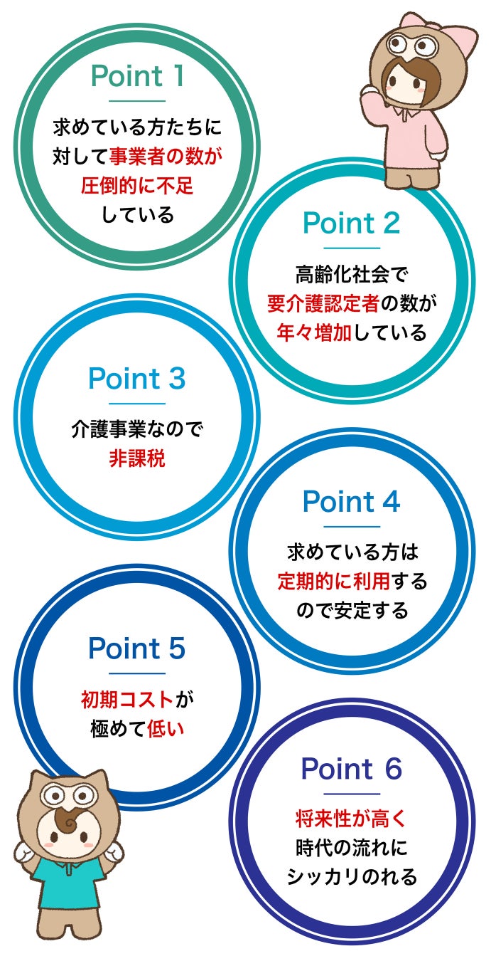 介護サービスが年々増加している中、今まで知識を持った人が少なく事業者数が一定でしたが、今後迎える超高齢化社会に向けて市場は大きいといえます。リピート顧客を獲得しやすい事業であることから、継続的に利益が得やすいビジネスです。