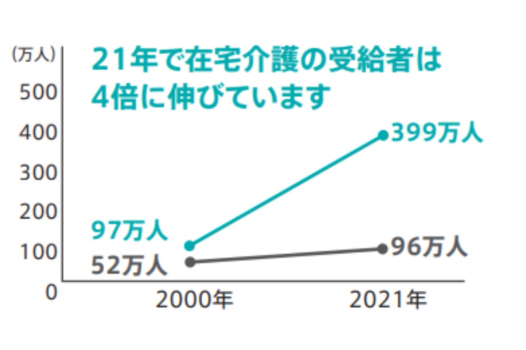 日本の高齢者人口は、2000年4月末以降、21年間で約1.6倍の1,414万人も増加していることをご存じでしょうか。それに伴い、介護在宅サービスの利用者は21年間で4.1倍に増加、需要は年々増加傾向にあります。