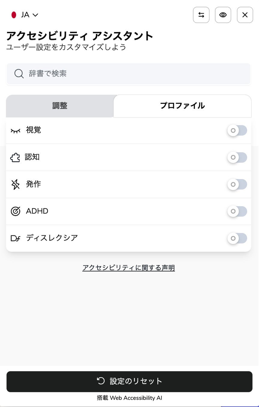 加えて、視覚・認知・てんかんなどの発作・ADHD・ディスレクシアの症状に対しては、1クリックで症状に合わせたウェブアクセシビリティを適用できます(※図3)。