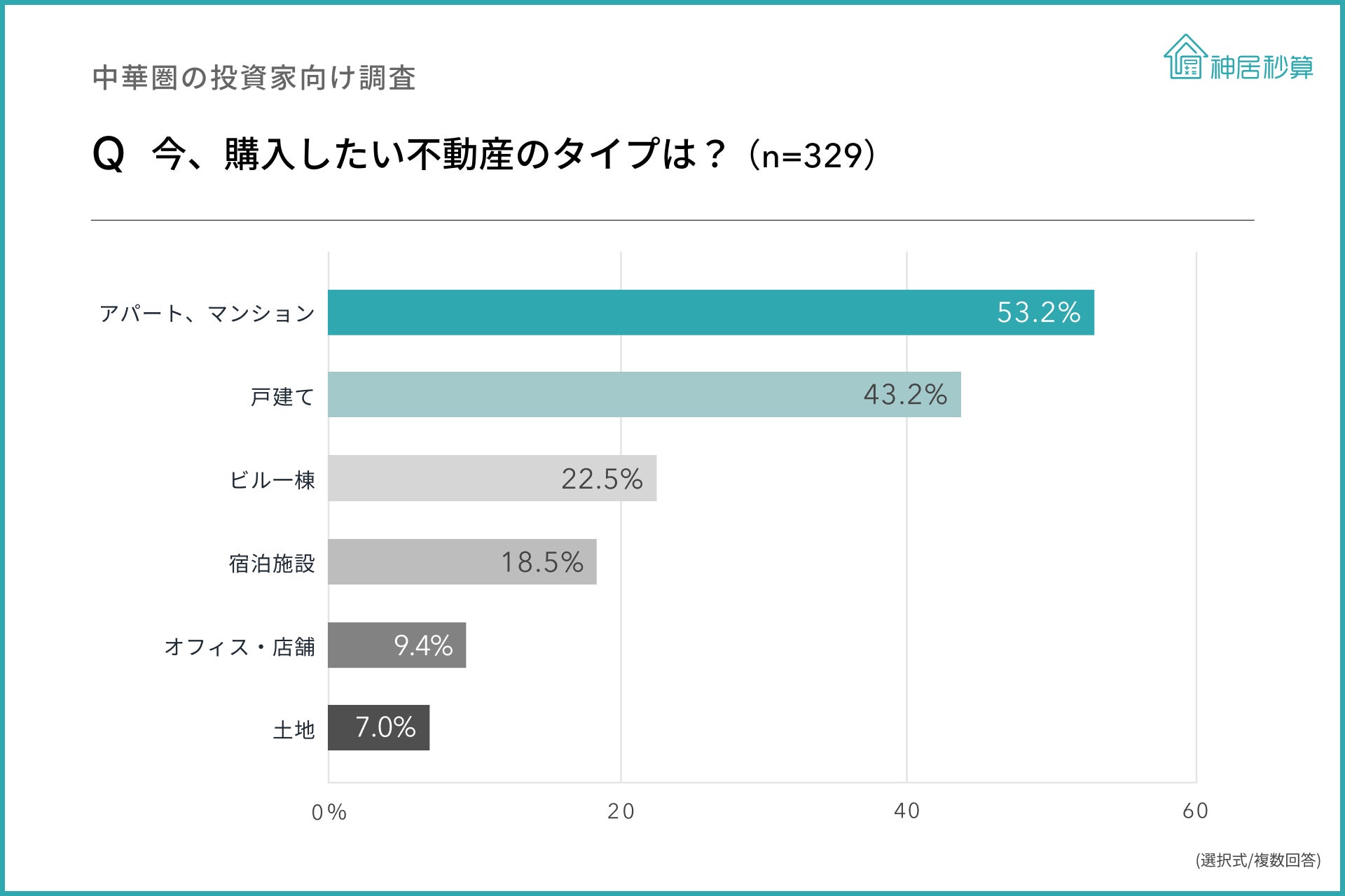 「今、購入したい不動産のタイプは?」と質問したところ、「アパート・マンション」という回答が53.2%になりました。次で「戸建て」が43.2%、「ビル一棟」が22.5%、「宿泊施設」が18.5%、「オフィス・店舗」が9.4%でした。アパート・マンションが昨年の調査結果(※3)と変わらず優位ですが、一方で昨年との違いの1つに「宿泊施設」の回答者増加が挙げられます。実際に神居秒算へお問い合わせいただいたユーザーは、旧正月や国慶節などの大型連休を利用した訪日後に増加傾向が見られることから、旅行などで実際に日本へ滞在したことで、日本への愛着が強まり、日本の不動産投資を検討する可能性が考えられます。