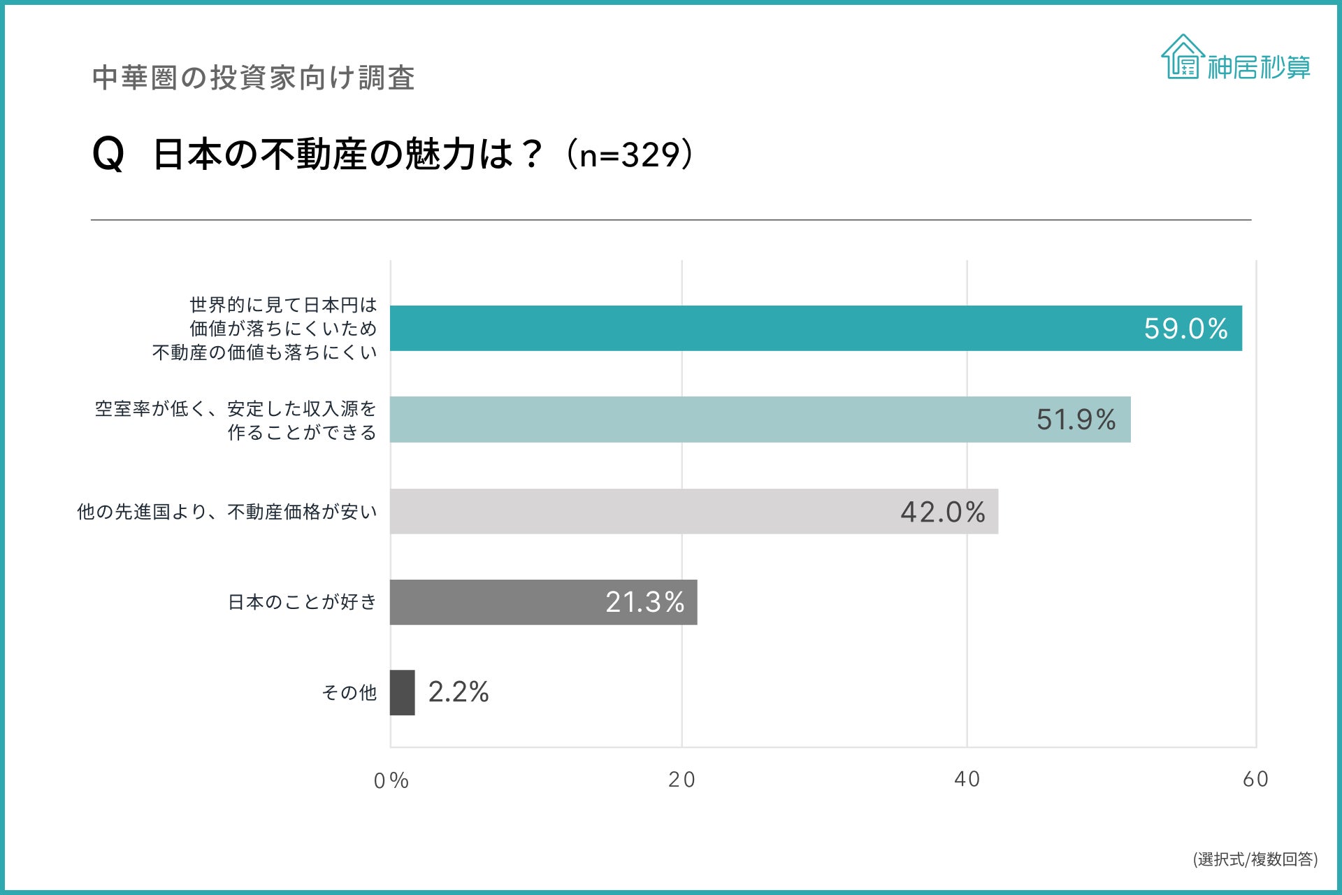「日本不動産の魅力は?」と質問すると、「世界的に見て日本円は価値が落ちにくいため、不動産の価値も落ちにくい」という回答が59.0%と最多でした。円安傾向が見られる一方で、中華圏投資家にとって日本の不動産は資産価値が高いと捉えられているようです。次いで「空室率が低く、安定した収入源を作ることができる」(51.9%)、「他の先進国より、不動産価格が安い」(42.0%)、「日本のことが好き」(21.3%)となりました。なお、CBRE Japanから2023年8月に発表された「日本の不動産投資市場:選ばれる理由」によると、日本はアジア太平洋地域の投資先としてクロスボーダー投資家が最も選好する国に挙げられています。(※2)