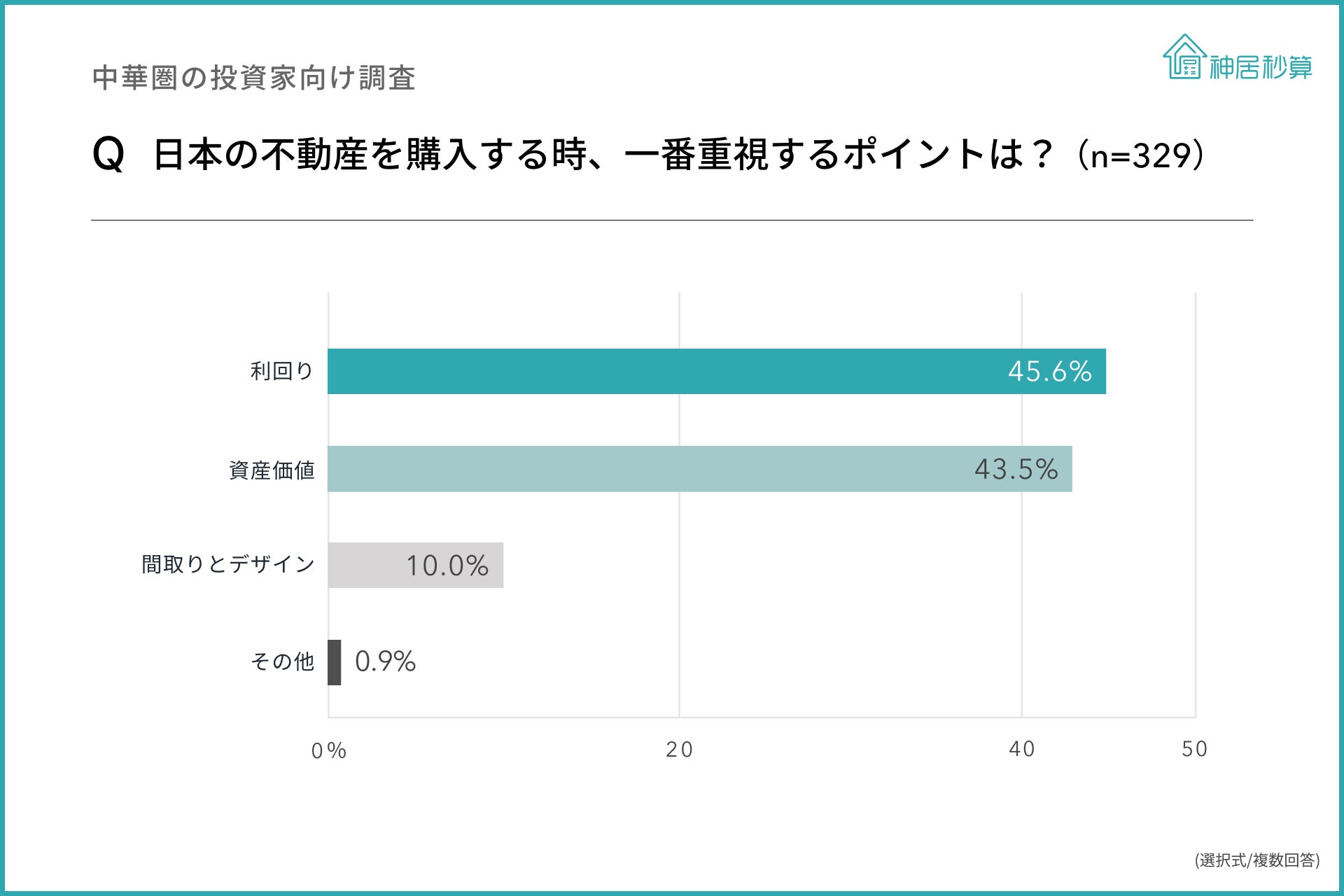 「日本の不動産を購入する時、一番重視するポイントは?」と質問したところ、「利回り」が45.6%で最多となりました。一方、次いで多かった「資産価値」という回答は43.5%と、「利回り」と比較すると2.1%の差であることが分かりました。このことから、中華圏の投資家は日本の不動産に対して、利回りと資産価値をほぼ同様に追求していることが分かります。その背景として、中華圏と日本の不動産に対する価値観の違いが考えられます。中華圏は日本と比較して「土地・不動産」を子孫に代々残せる「資産」として見る文化が根強いようです。