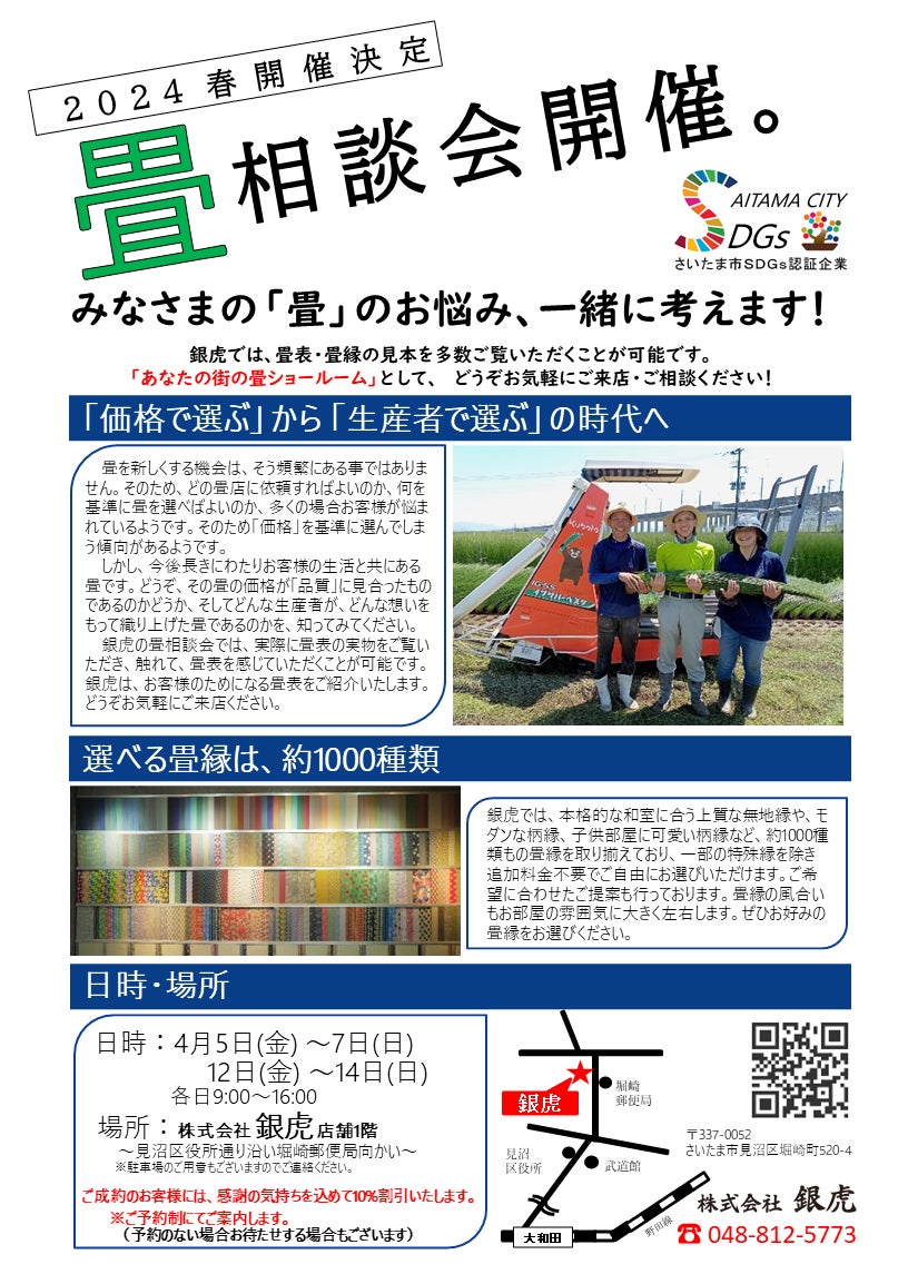 畳の品質の良し悪しは、張り替え直後は一見すると判断は難しいものです。しかし、触れて香っていただくことでその差は誰にでも明らかに感じることができます。私たち銀虎では、いつでもお客様に大きな畳の見本をご覧いただくことが可能です。しかし、知らない畳店の暖簾をくぐる事に抵抗を感じてしまうお客様も少なくないというお声を伺っています。ぜひ「畳相談会」にお気軽にご参加いただき、畳の見本に触れて・香って畳を感じてください。