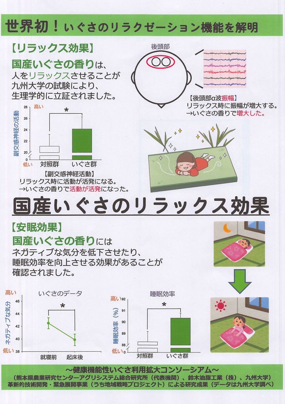 九州大学による試験で、熊本八代の畳は、原料であるい草にリラックス効果を持つことが生理学的に立証されました。また、畳の持つ7つの機能(温度調節・湿度調節・弾力性・空気清浄・香り・防音吸音・アセトアルデヒド吸着)も知られています。 つまり、品質の良い畳は、お子様の健やかな成長にとってかかせない住空間の条件である、安心安全と心地よさの共存を満たしてくれるのです。『ベビーベッド畳』はベビーベットや床の上に敷くだけでお子様の成長に最適な空間を創ります。